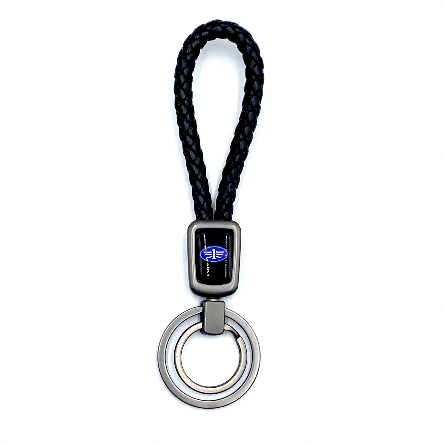Брелок для ключей кожаный с эмблемой Faw (кожзам, косичка, двойное кольцо, черный цвет)