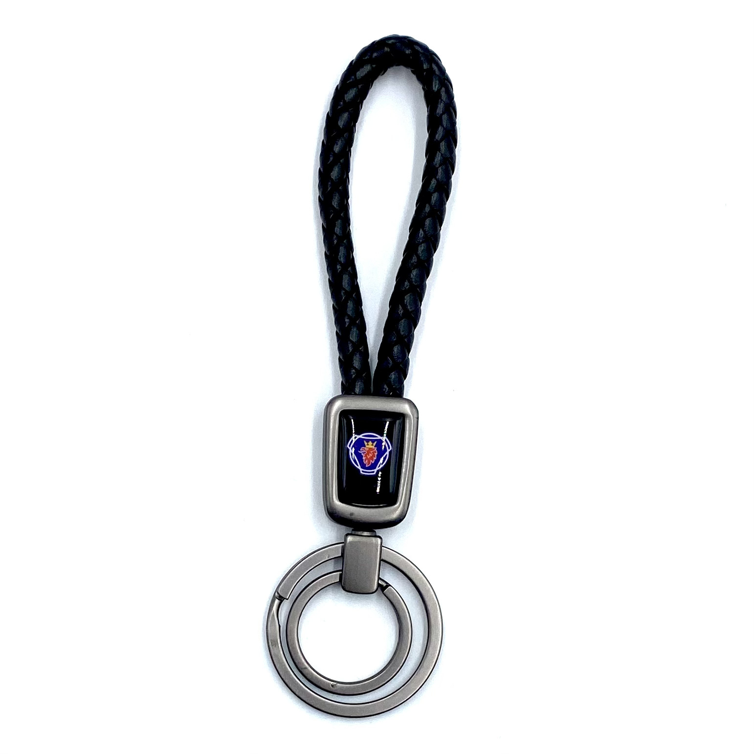 Брелок для ключей кожаный с эмблемой Scania (кожзам, косичка, двойное кольцо, черный цвет)