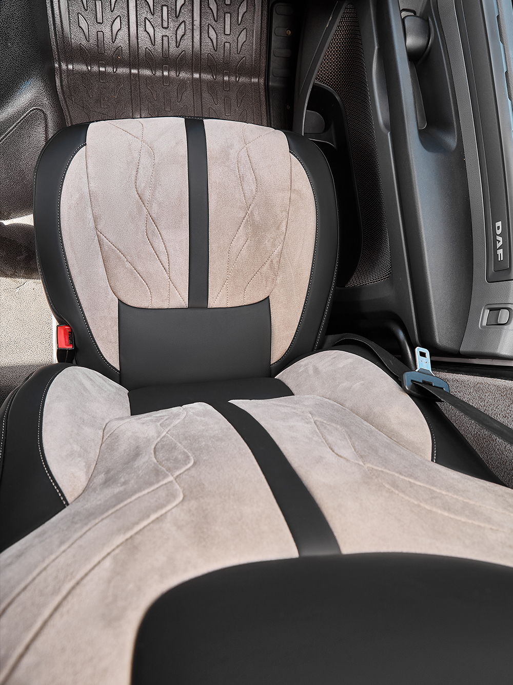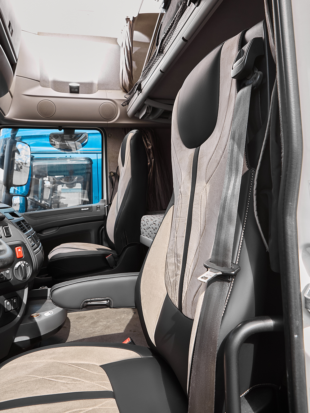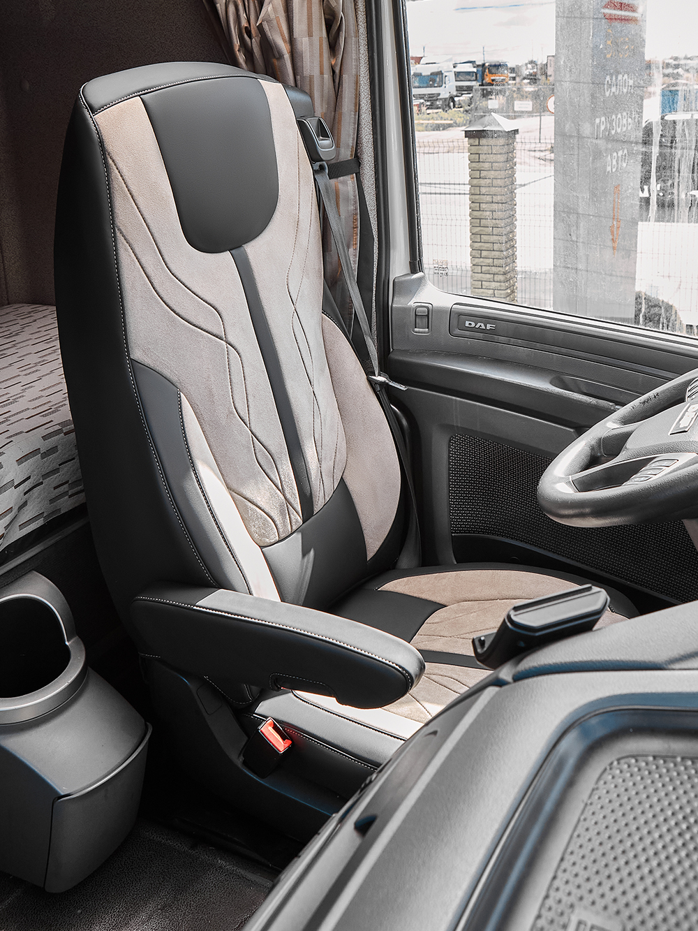 Комплект чехлов ЛЮКС (2шт: водитель+пассажир) на сиденья грузовиков DAF. Стильные чехлы премиального уровня.