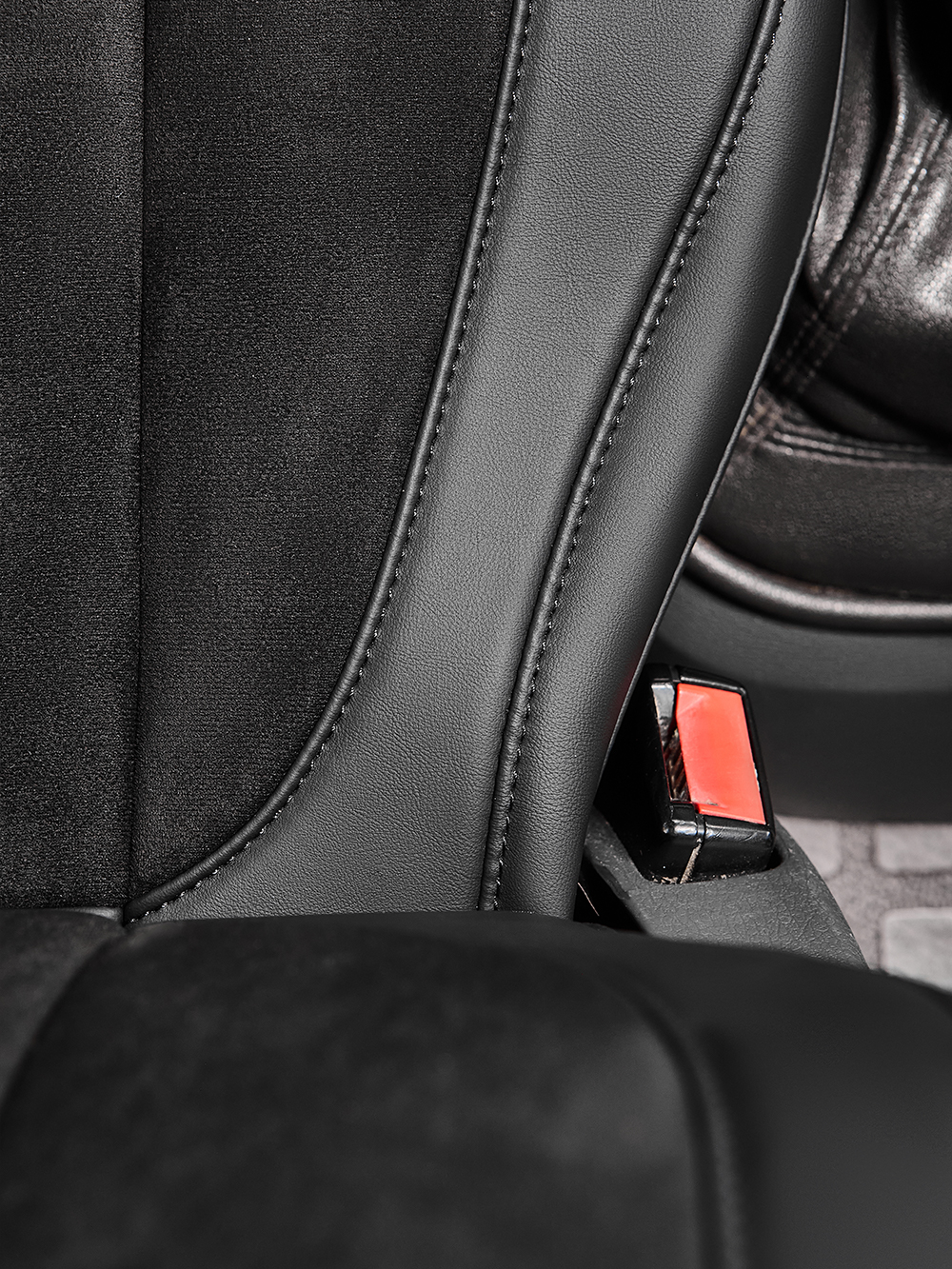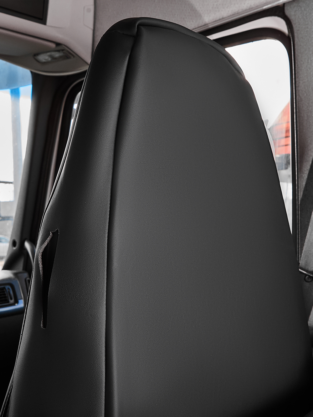 Чехлы Люкс VOLVO FH-13 после 2018 года: водитель от сиденья, пассажир от стойки кабины (один вырез под ремень) (экокожа, черный, черная вставка)