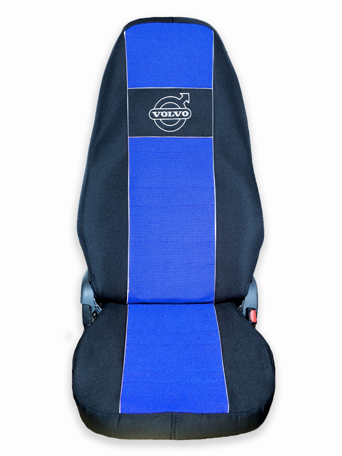 Чехлы VOLVO FH-12 после 2003 года: два высоких сиденья, ремни из сиденья (есть вырезы под ремень) (полиэфир, черный, синяя вставка)