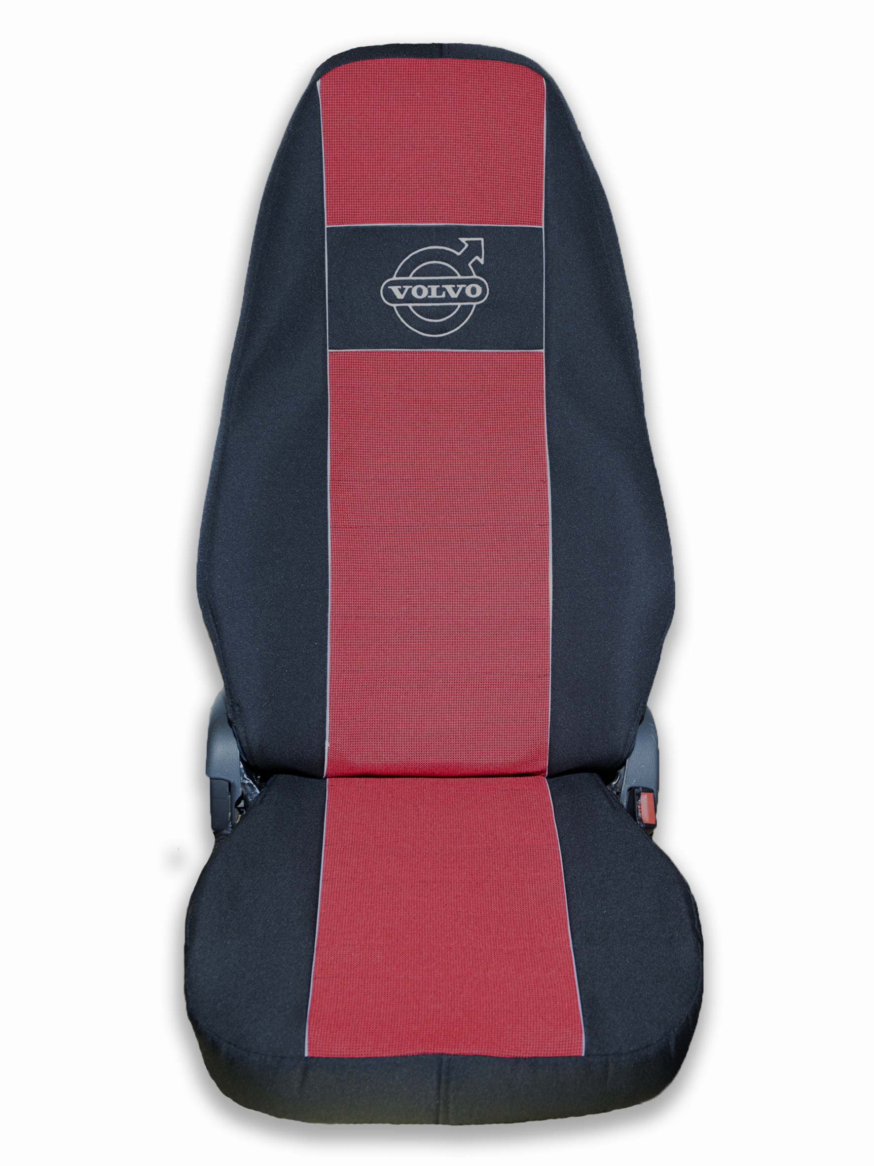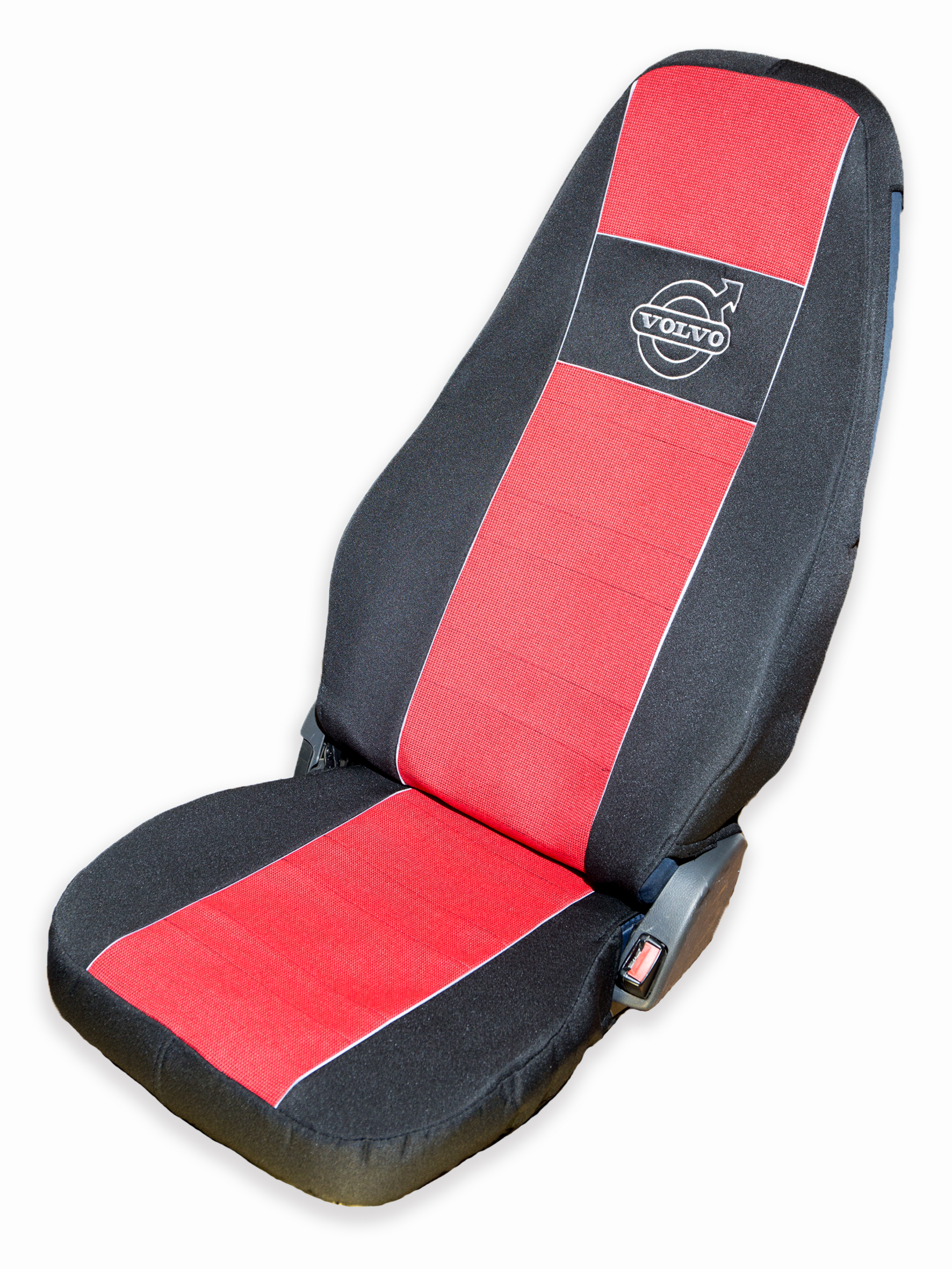 Чехлы VOLVO FH 12 после 2003 года: два высоких сиденья, ремни от стоек кабины (нет выреза под ремень) (полиэфир, черный, красная вставка)
