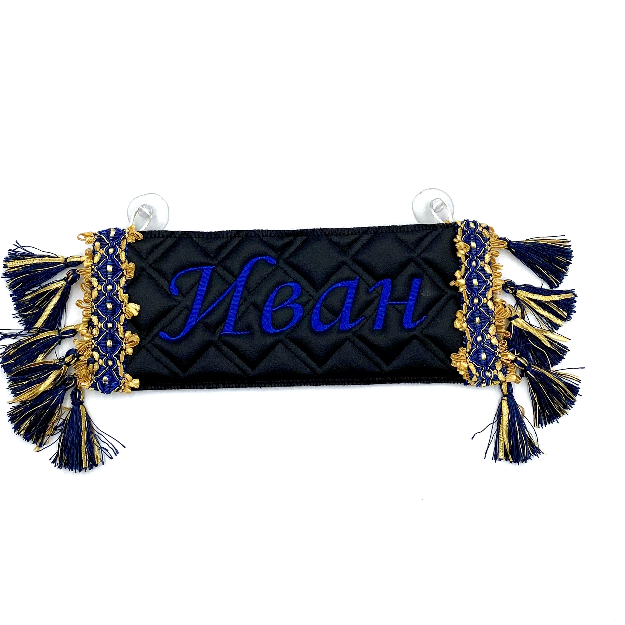 Двусторонний вымпел-карман для автомобиля с вышивкой и отделкой бахромой.