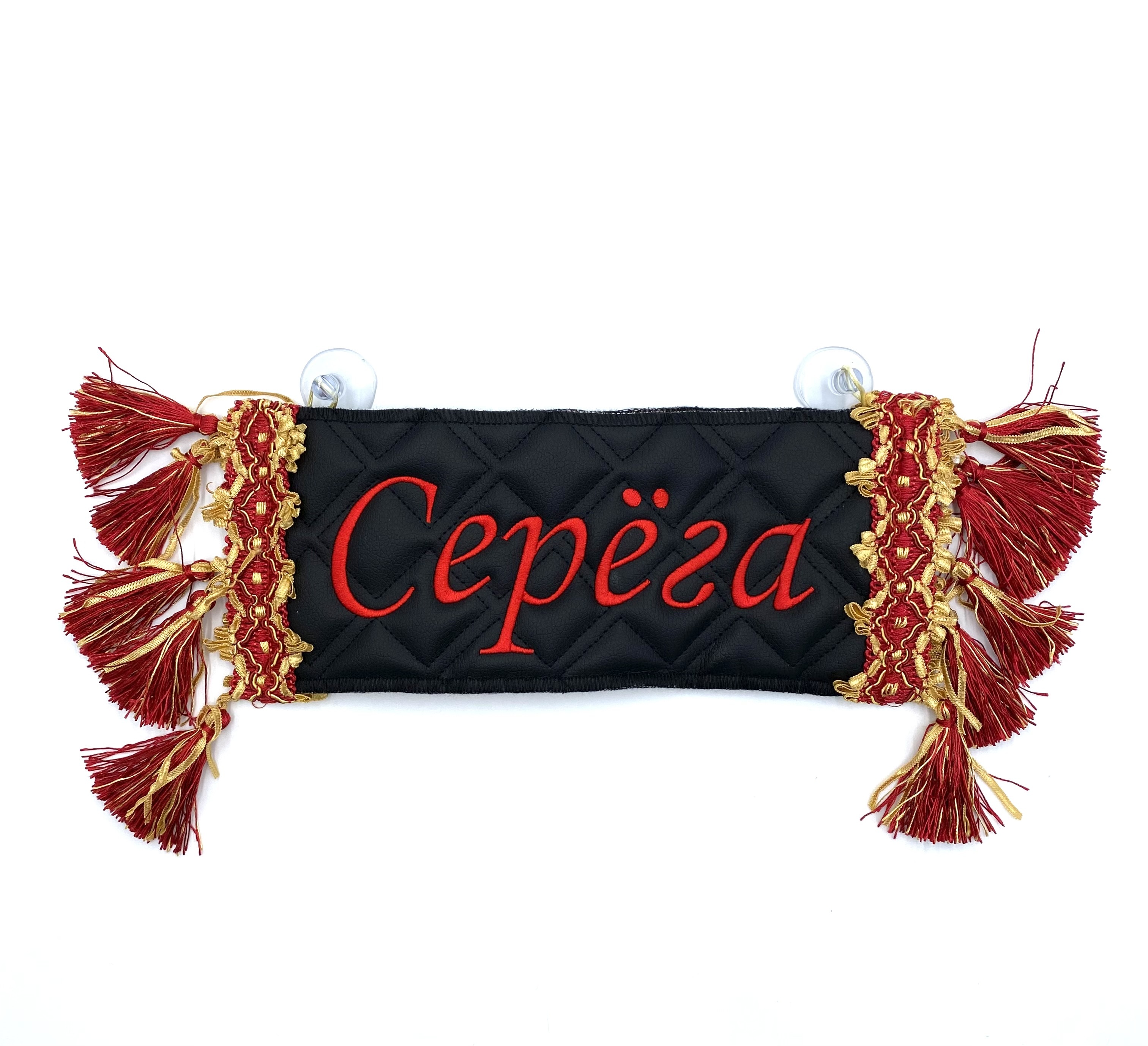 Двусторонний вымпел-карман для автомобиля с вышивкой и отделкой бахромой.