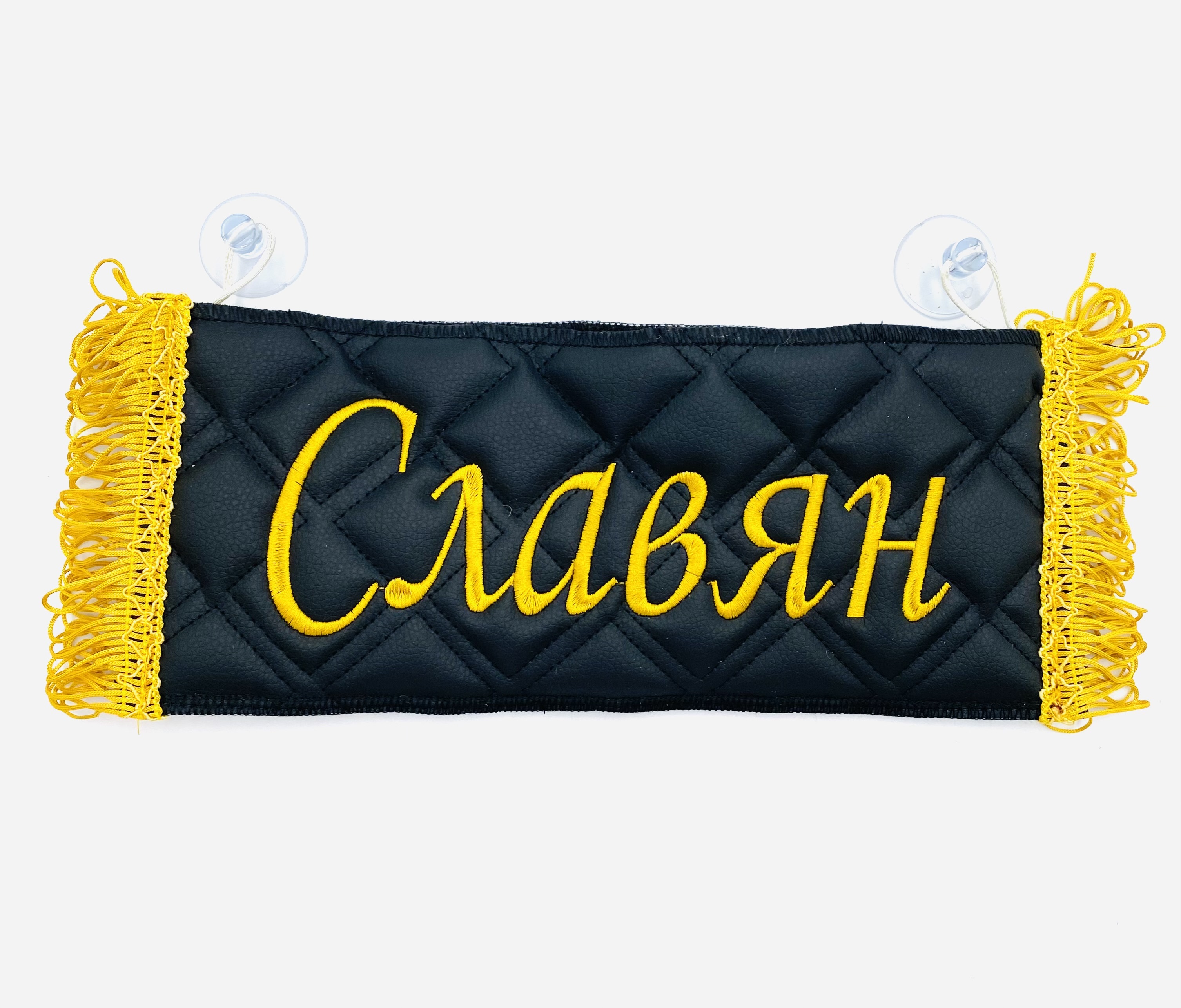 Двусторонний вымпел-карман для автомобиля с вышивкой и отделкой бахромой.