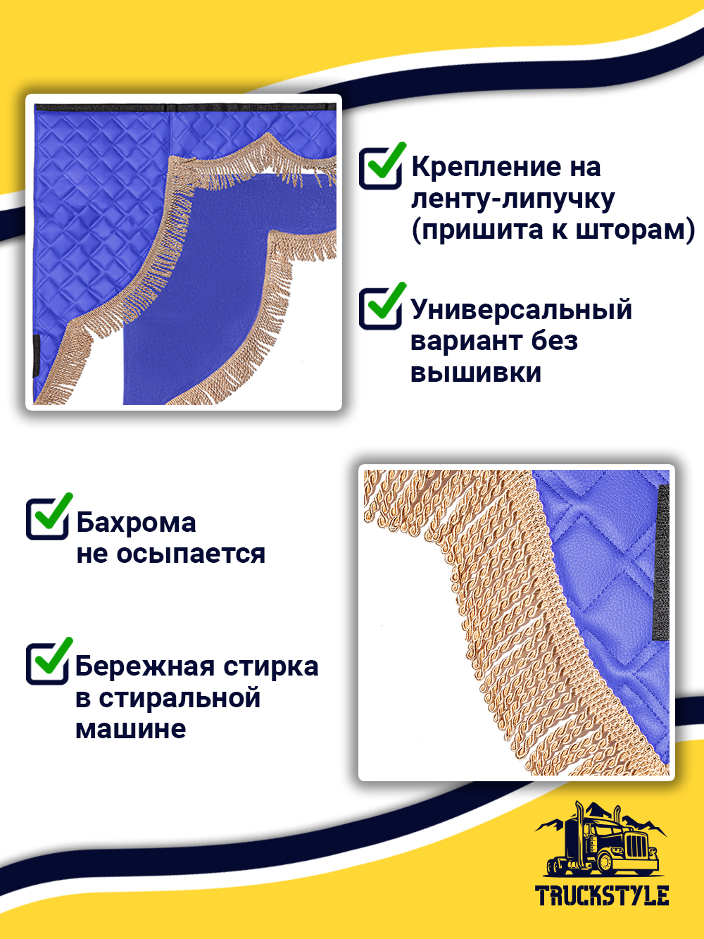 • Крепление ламбрекена и косынок осуществляется на ленту липучку, одна часть которой пришита к изделию, а другая крепится на внутреннюю стенку салона авто. Такое крепление позволяет без труда снимать их для чистки и ухода. Шторки можно стирать в стиральной машине.
