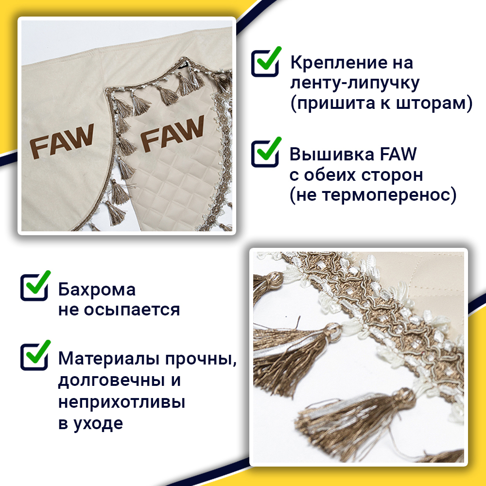 • Ширина лобового ламбрекена 225 см – подходит для седельных тягачей, одиночек и самосвалов FAW.