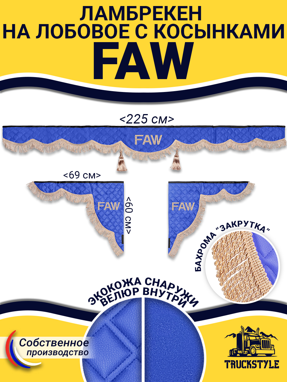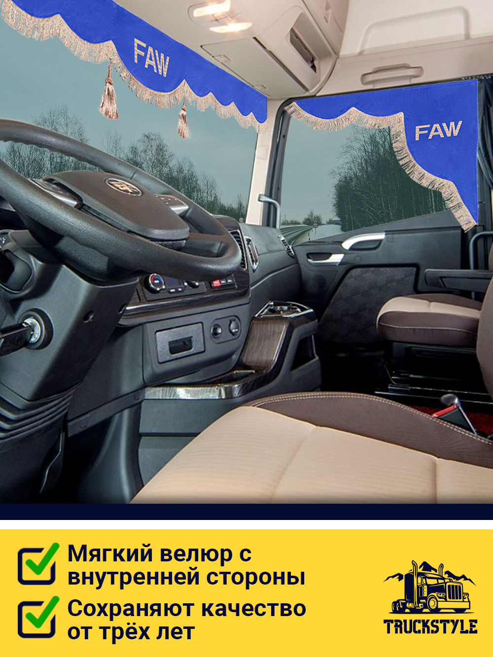 • Ширина лобового ламбрекена 225 см – подходит для седельных тягачей, одиночек и самосвалов FAW.