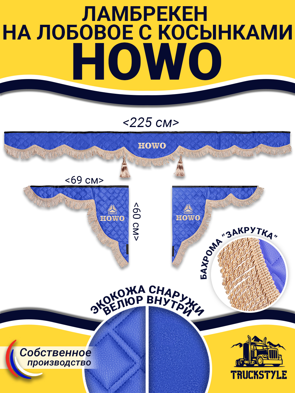 • Ширина лобового ламбрекена 225 см – подходит для седельных тягачей, одиночек и самосвалов Howo.