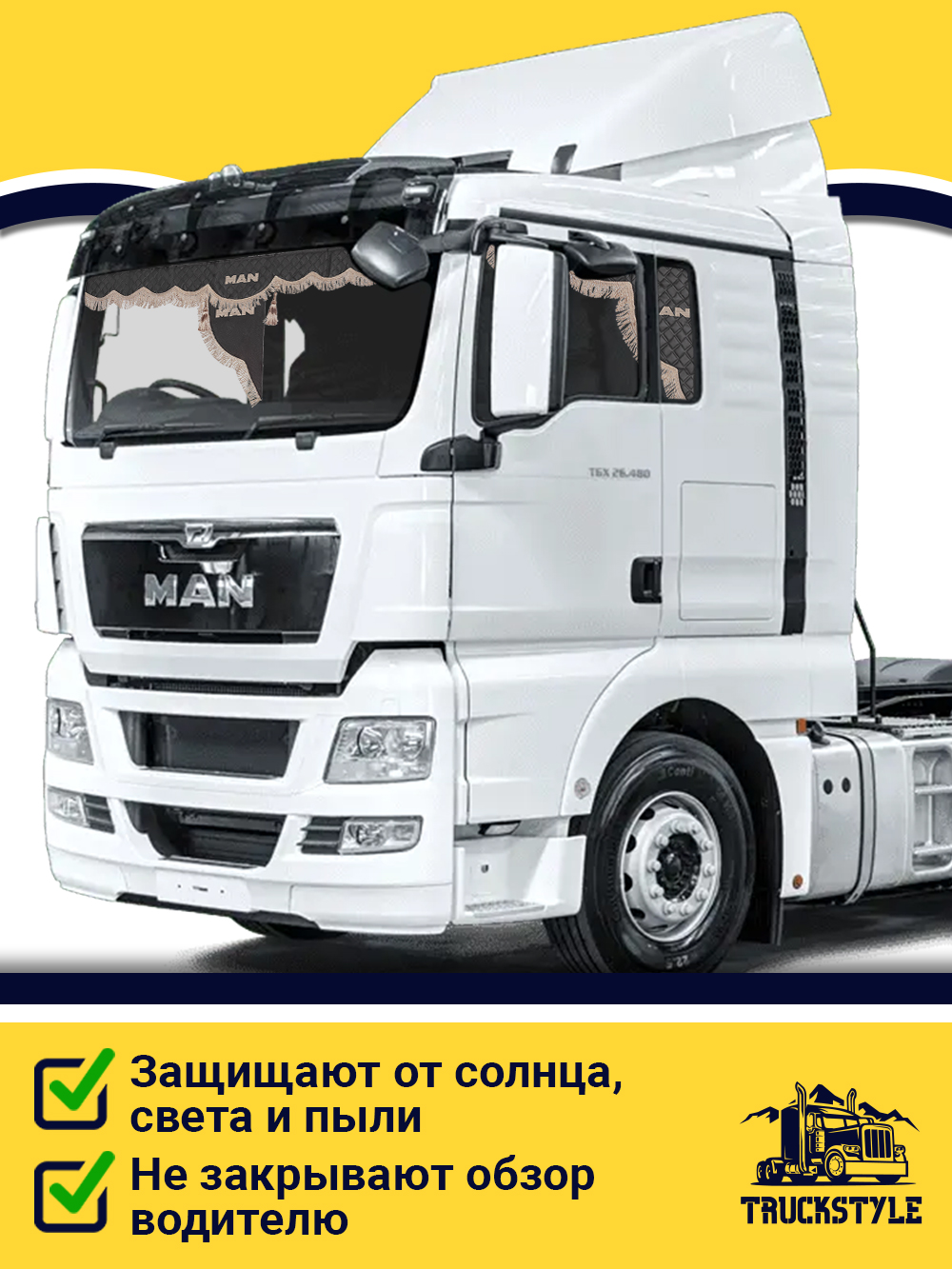 • Ширина лобового ламбрекена 225 см – подходит для седельных тягачей, одиночек и самосвалов MAN.