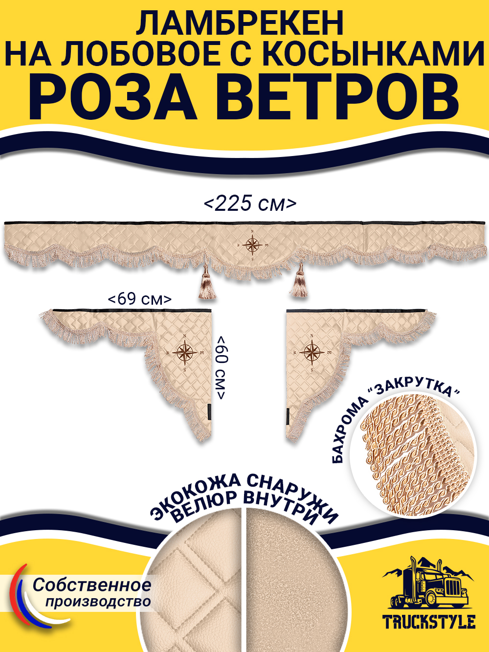 Ламбрекен для лобового стекла + Косынки на боковые стекла для грузовых а/м с вышивкой «Роза Ветров».