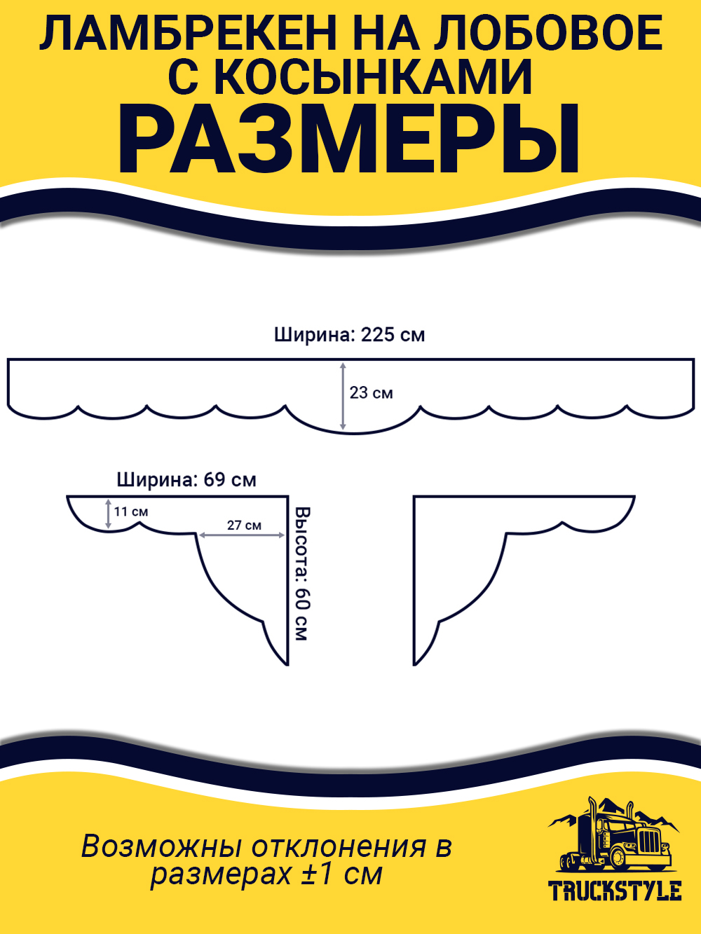 • Ширина лобового ламбрекена 225 см – подходит для седельных тягачей, одиночек и самосвалов.