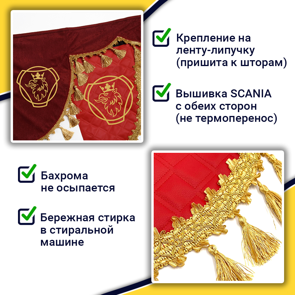 Ламбрекен с косынками стеганые Scania (экокожа, красный, золотые кисточки)
