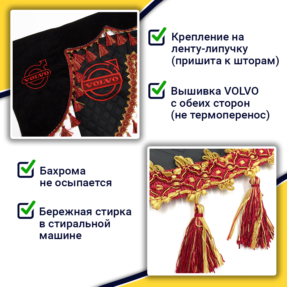 • Крепление ламбрекена и косынок осуществляется на ленту липучку, одна часть которой пришита к изделию, а другая крепится на внутреннюю стенку салона авто. Такое крепление позволяет без труда снимать их для чистки и ухода. Шторки можно стирать в стиральной машине.