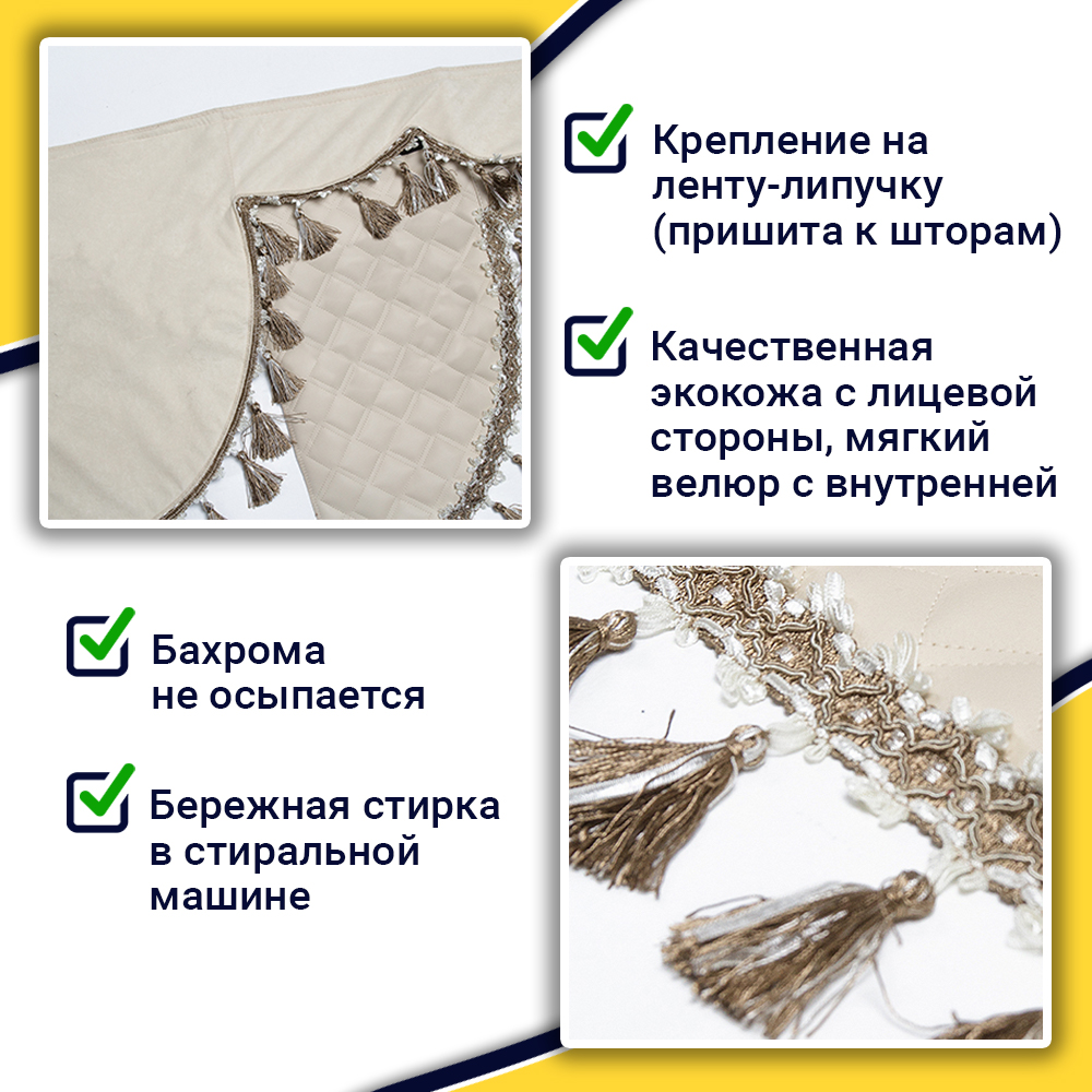 • Крепление ламбрекена и косынок осуществляется на ленту липучку, одна часть которой пришита к изделию, а другая крепится на внутреннюю стенку салона авто. Такое крепление позволяет без труда снимать их для чистки и ухода. Шторки можно стирать в стиральной машине.