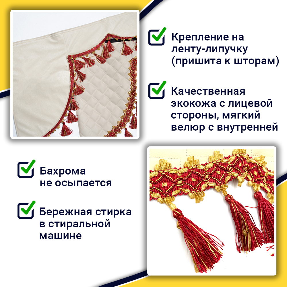 • Крепление ламбрекена и косынок осуществляется на ленту липучку, одна часть которой пришита к изделию, а другая крепится на внутреннюю стенку салона авто. Такое крепление позволяет без труда снимать их для чистки и ухода. Шторки можно стирать в стиральной машине.