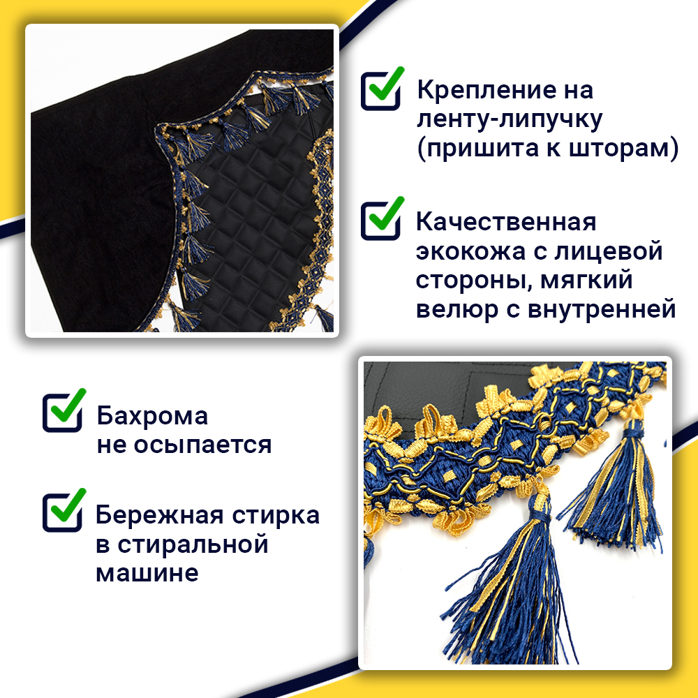 • Крепление ламбрекена и косынок осуществляется на ленту липучку, одна часть которой пришита к изделию, а другая крепится на внутреннюю стенку салона авто. Такое крепление позволяет без труда снимать их для чистки и ухода. Шторки можно стирать в стиральной машине.