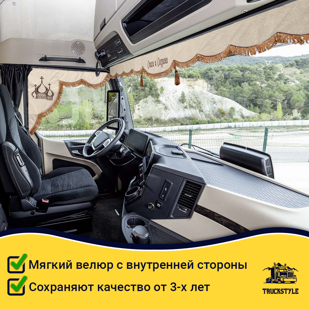 Ламбрекен для лобового стекла + Косынки на боковые стекла для грузовых а/м с вышивкой «Спаси и Сохрани».