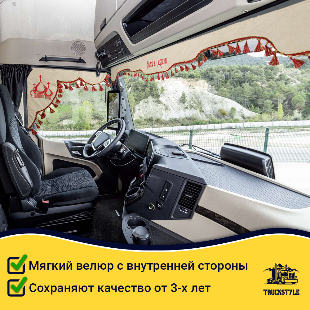 Ламбрекен для лобового стекла + Косынки на боковые стекла для грузовых а/м с вышивкой «Спаси и Сохрани».