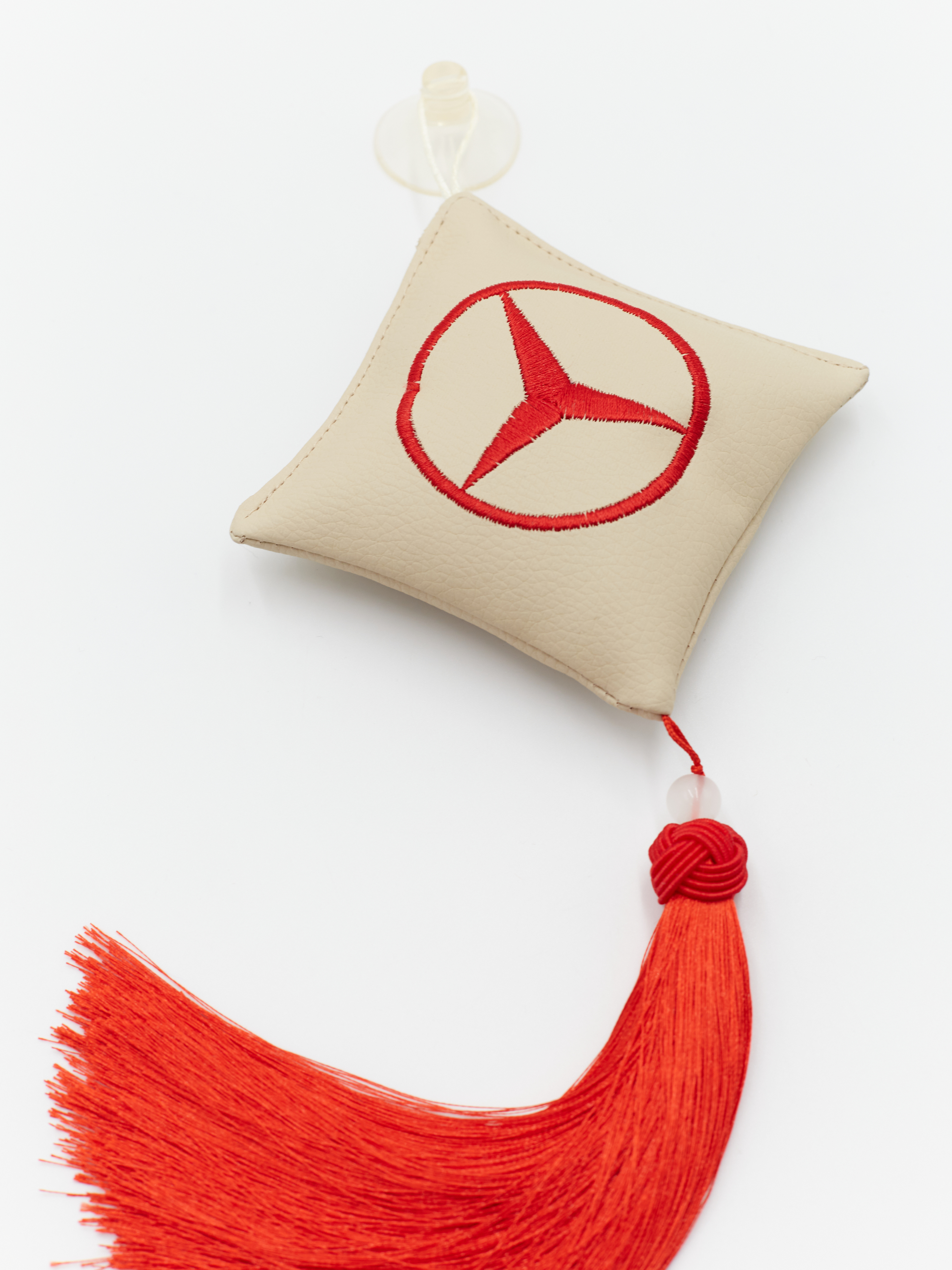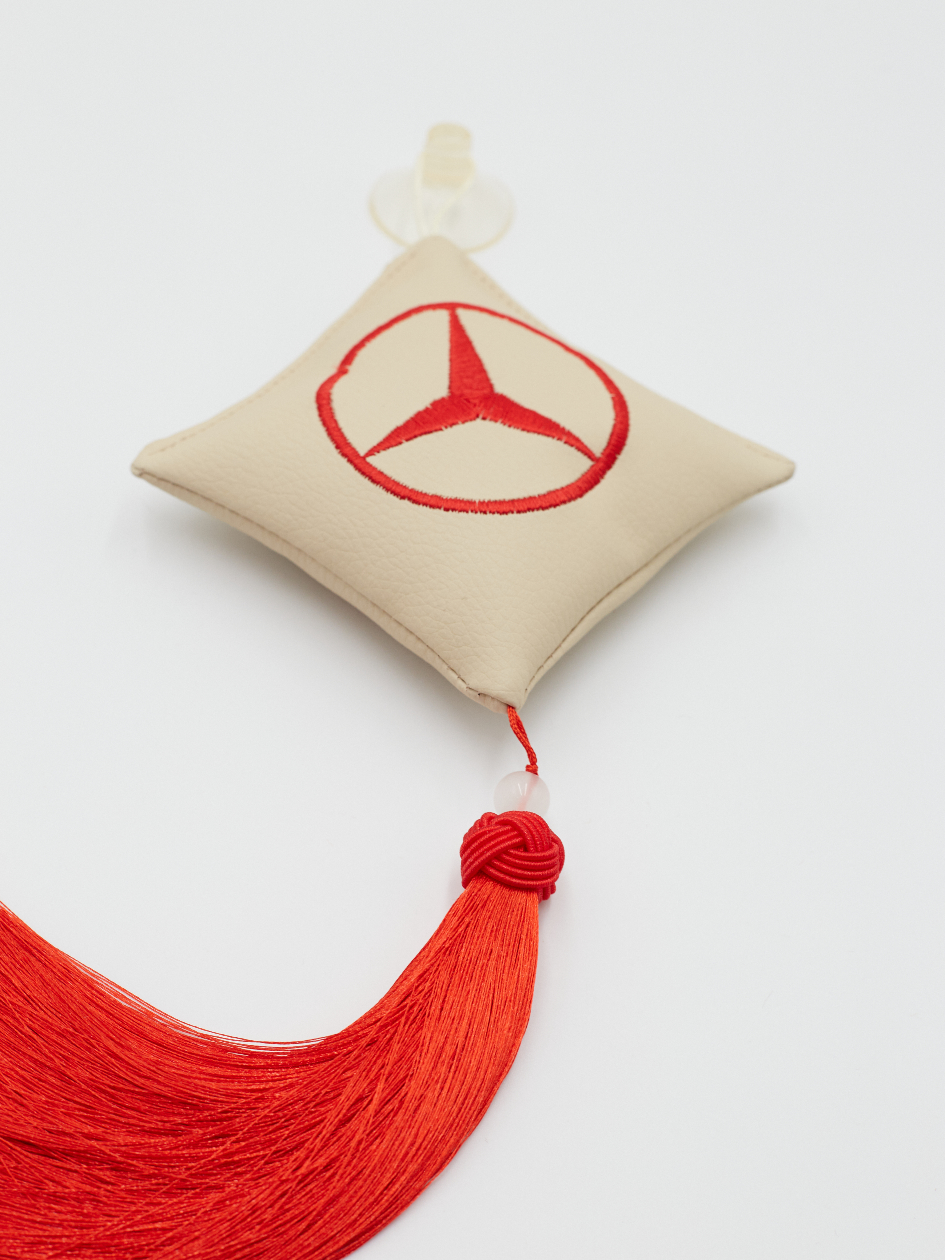 Ромб объемный на присоске MERCEDES (экокожа, бежевый, красная вышивка, кисть)