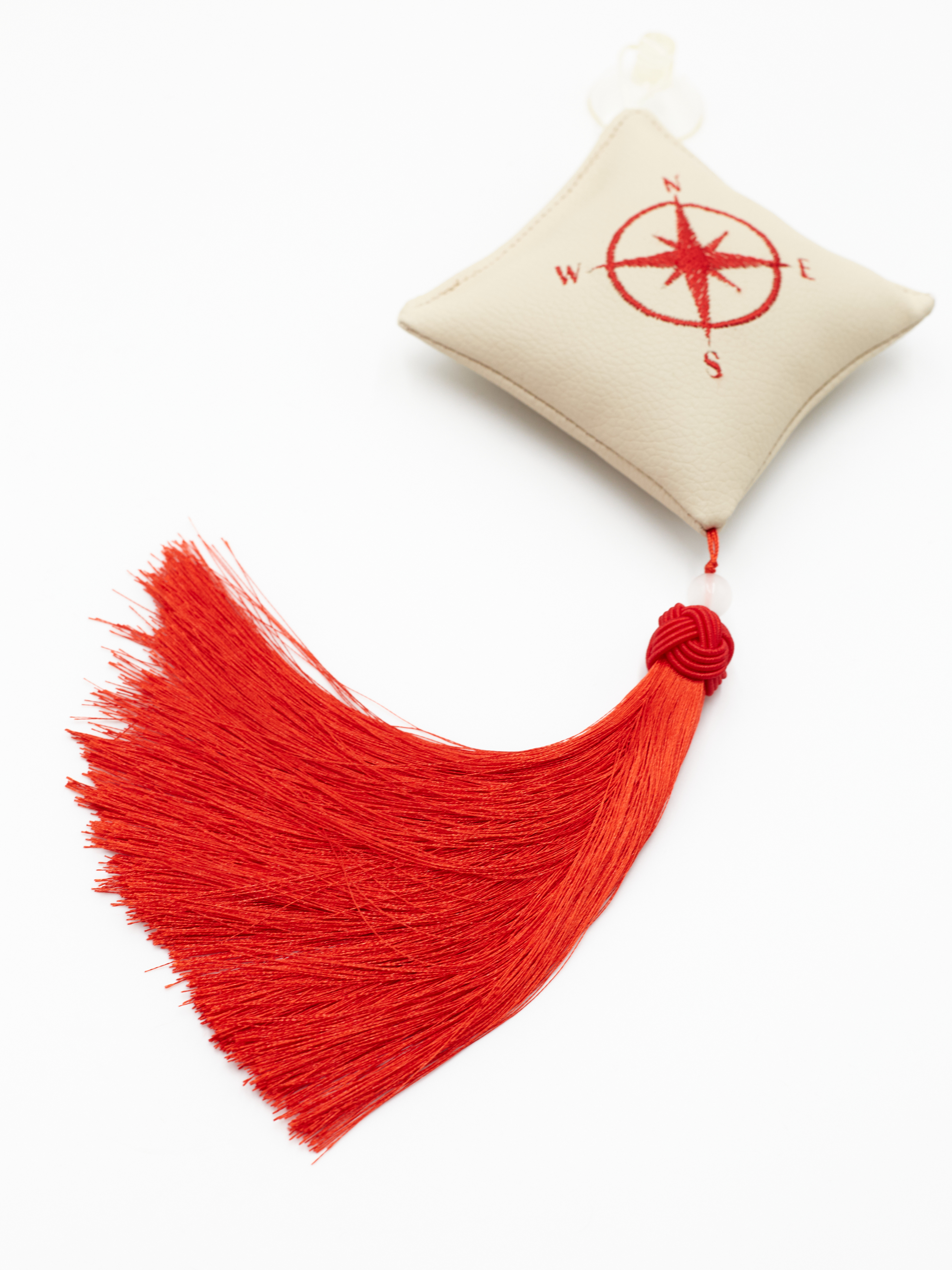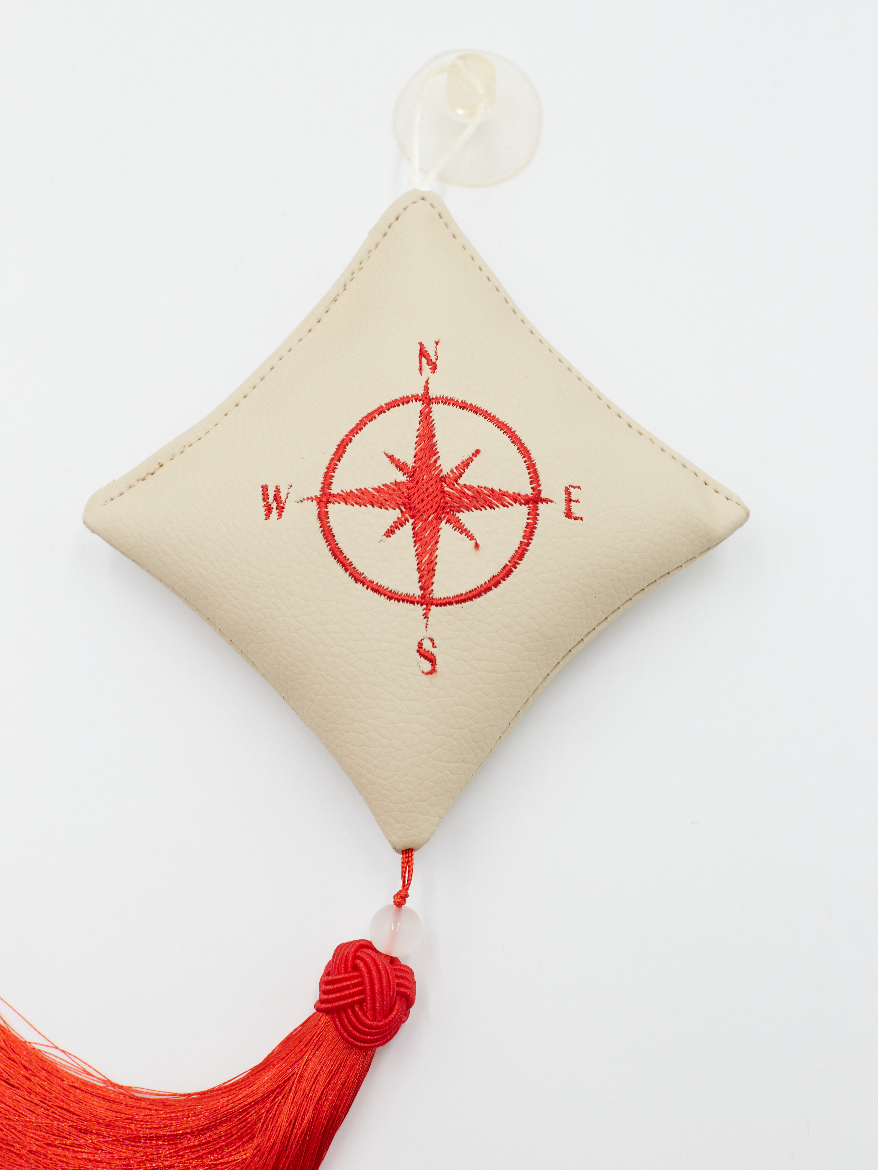Ромб объемный на присоске Роза Ветров (экокожа, бежевый, красная вышивка, кисть)