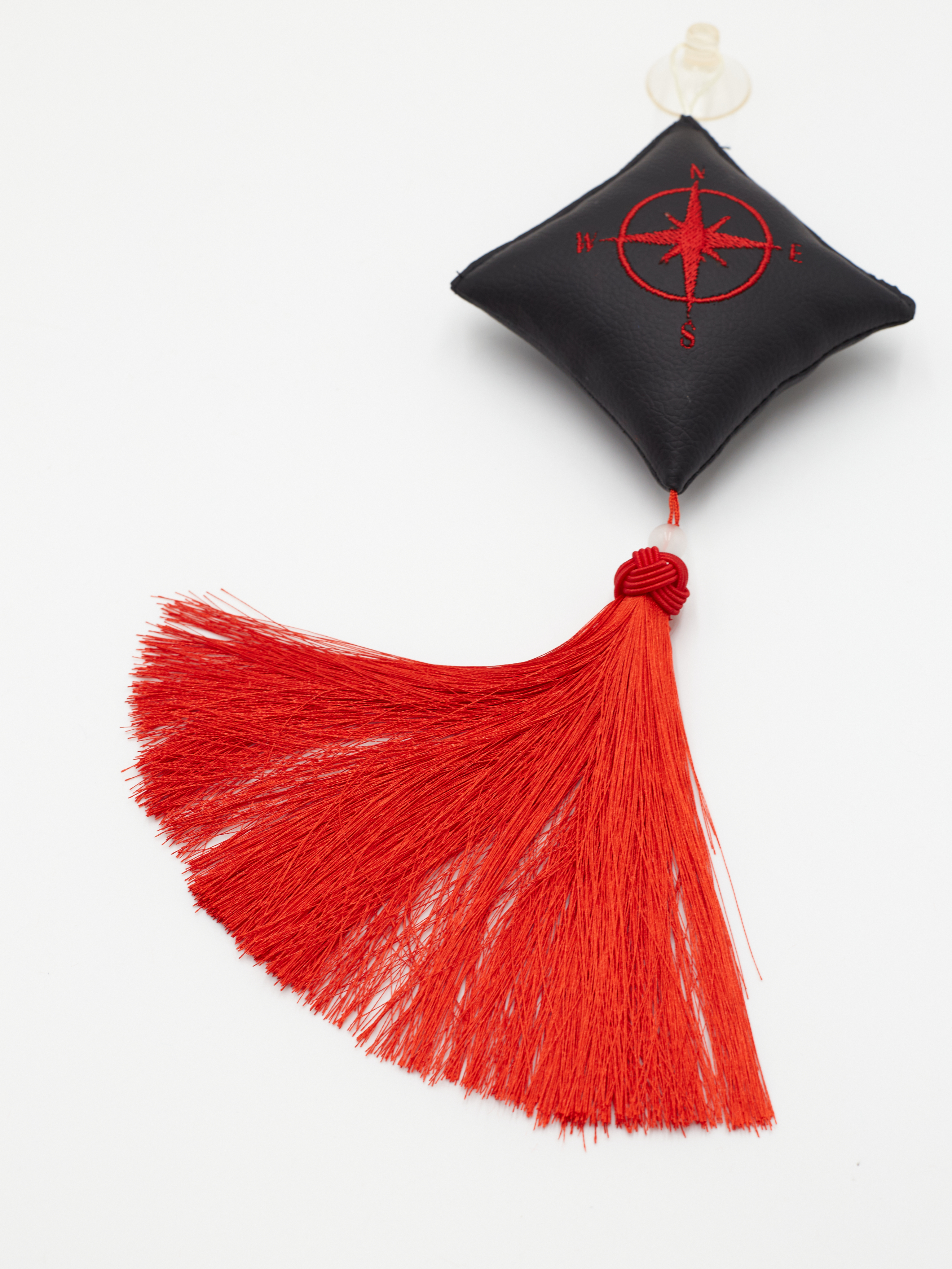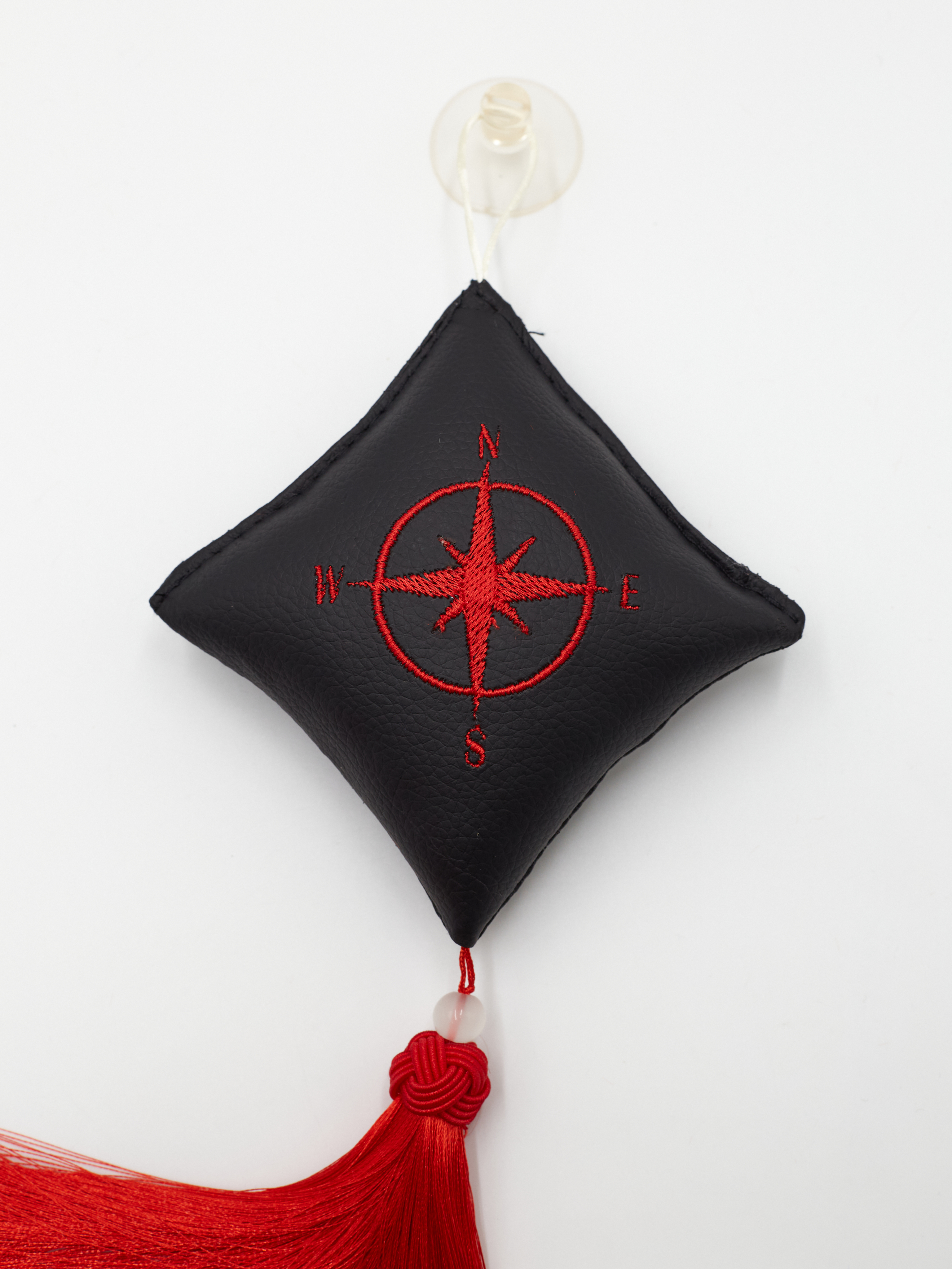 Ромб объемный на присоске Роза Ветров (экокожа, черный, красная вышивка, кисть)