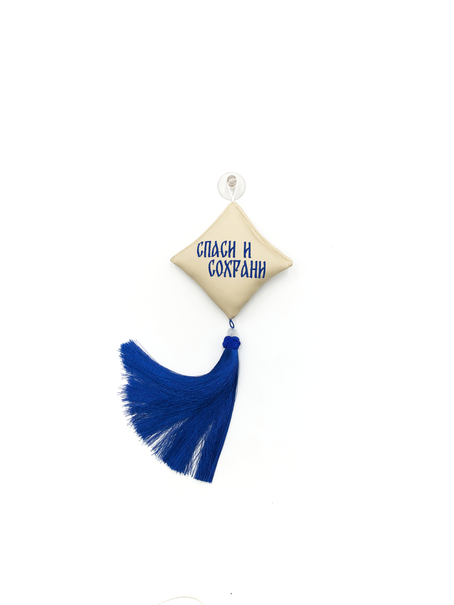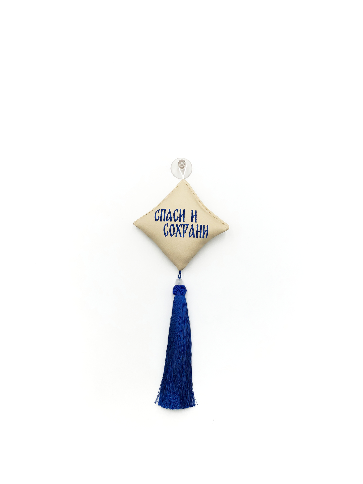 Ромб объемный на присоске Спаси и Сохрани (экокожа, бежевый, синяя вышивка, кисть)
