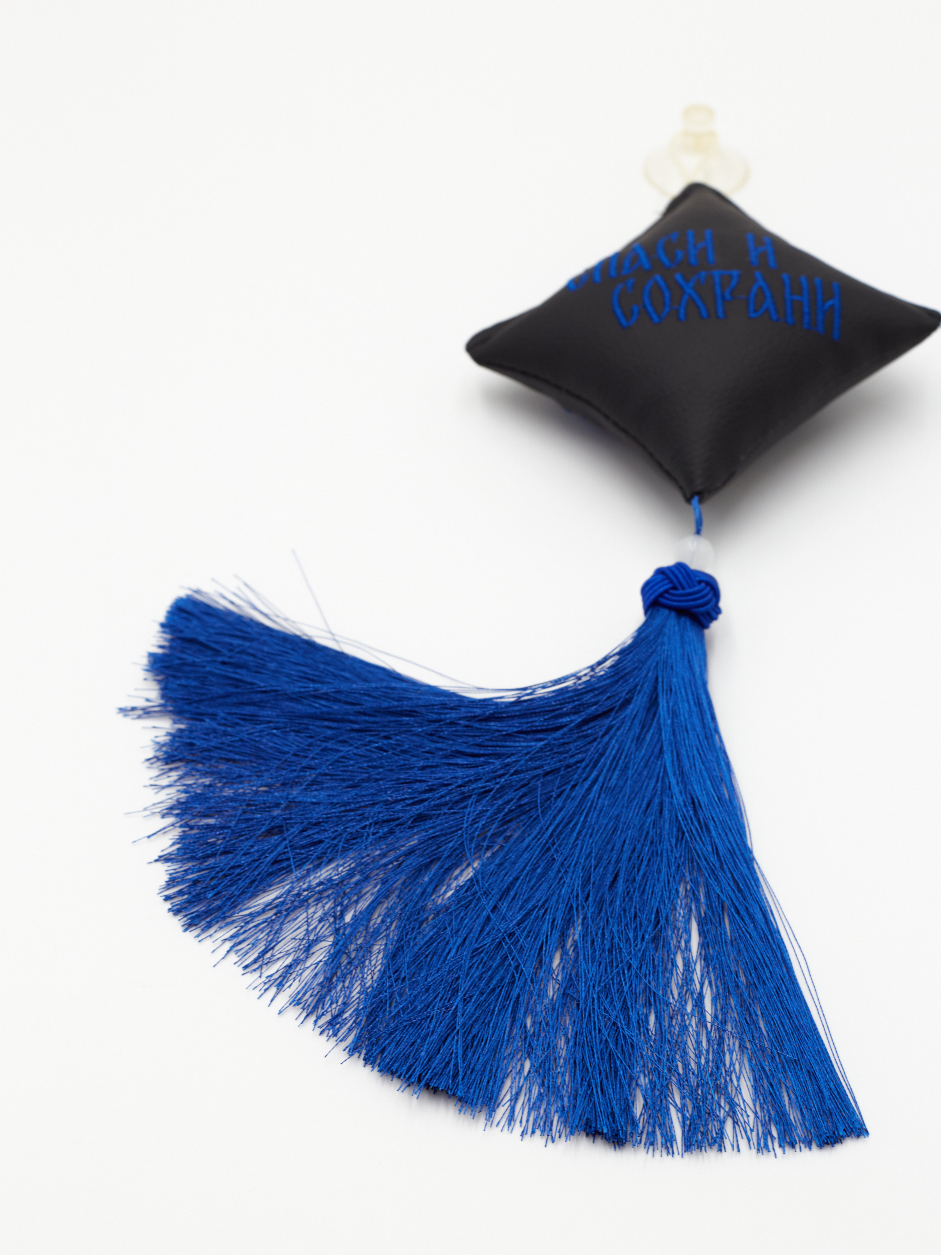Ромб объемный на присоске Спаси и Сохрани (экокожа, черный, синяя вышивка, кисть)