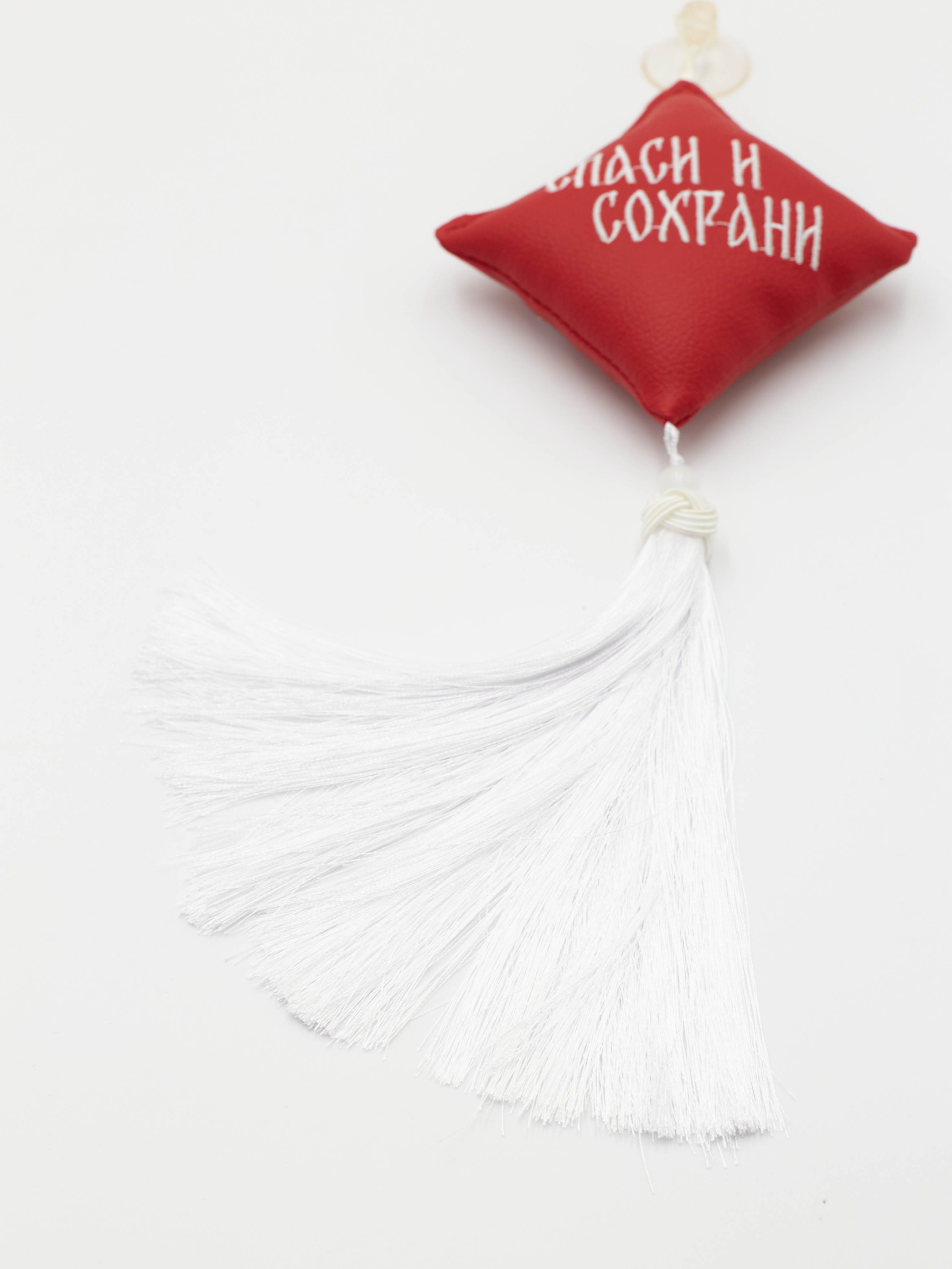 Ромб объемный на присоске Спаси и Сохрани (экокожа, красный, белая вышивка, кисть)