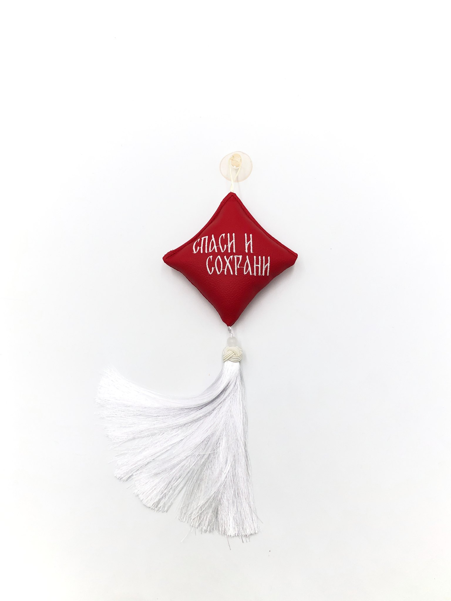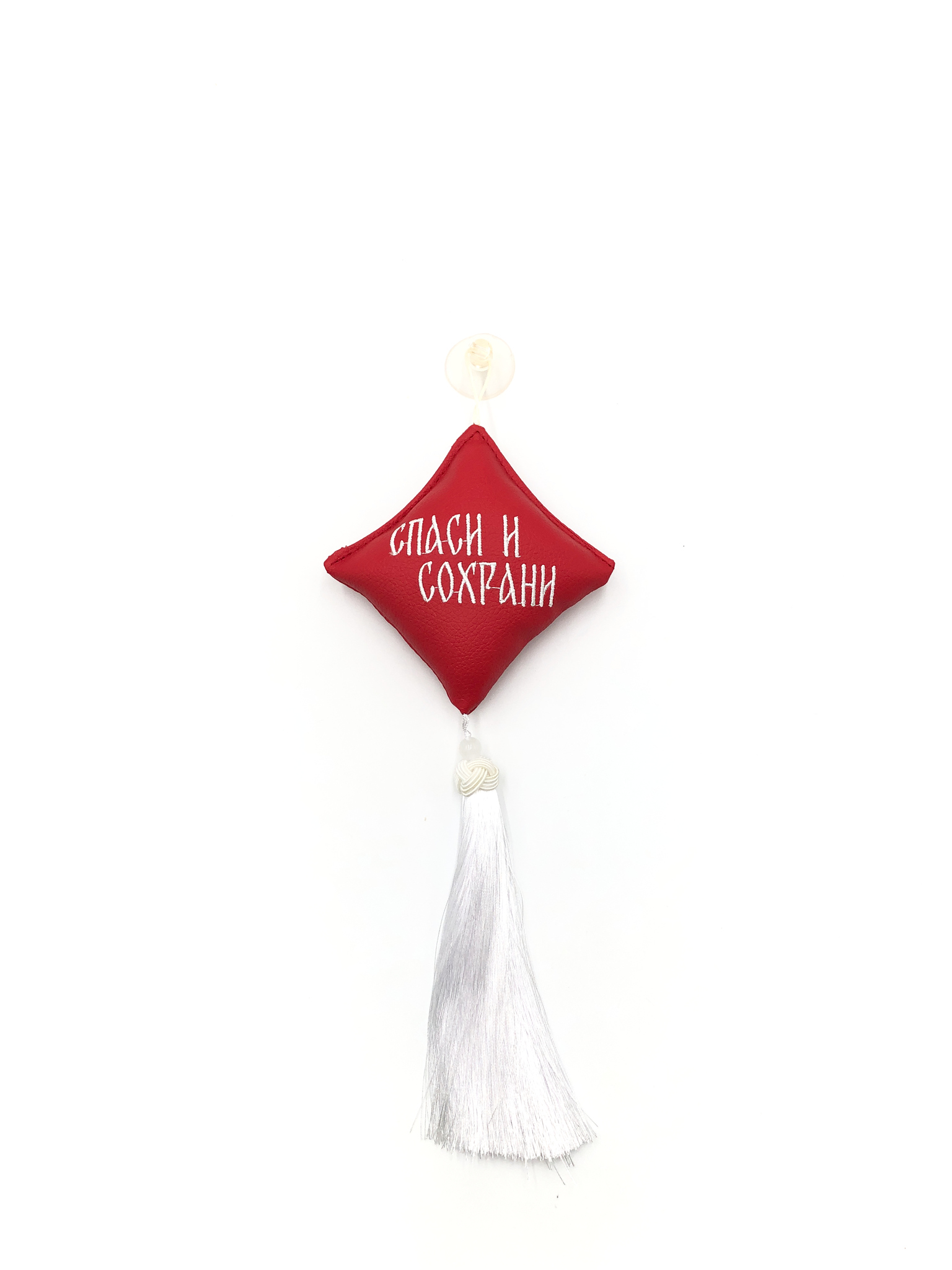 Объемный ромб на присоске с кисточкой на лобовое Спаси и Сохрани. Экокожа