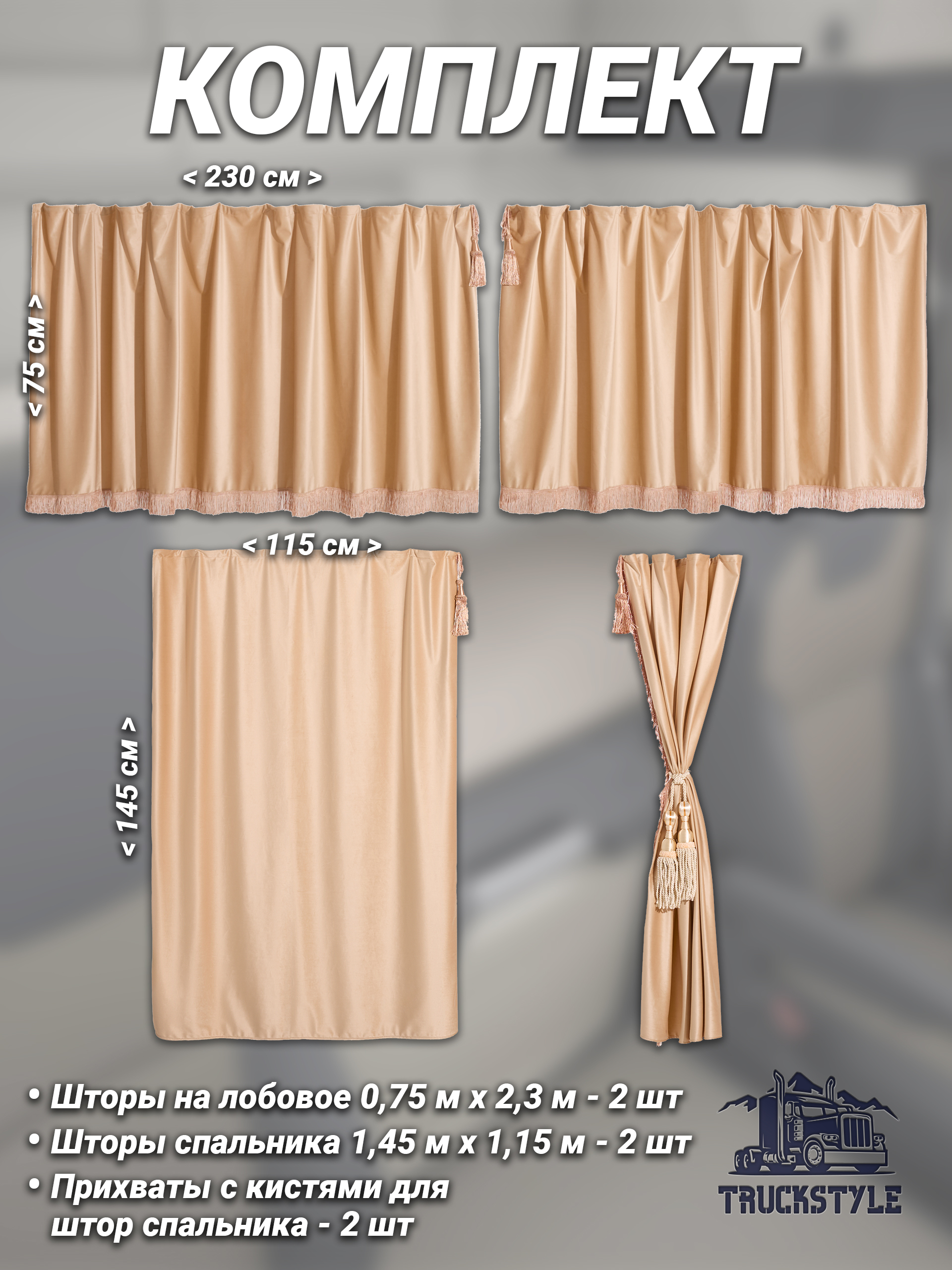 В комлект входят: 2 лобовые шторы 0,75х2,30м каждая, 2 шторы спальника 1,45х1,15м каждая, подхваты-кисти 2шт