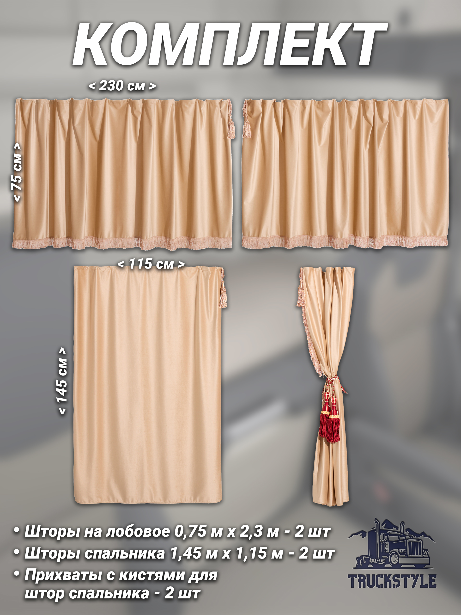 Шторы на лобовое (высота 0,75м, ширина одной стороны - 2,30м) и спальное место (высота 1,45м, ширина одной стороны - 1,15м) с бахромой и кистями в кабину грузовика. Полный комплект. Блэкаут, велюр. Бежевый цвет с красными кистями-прихватами