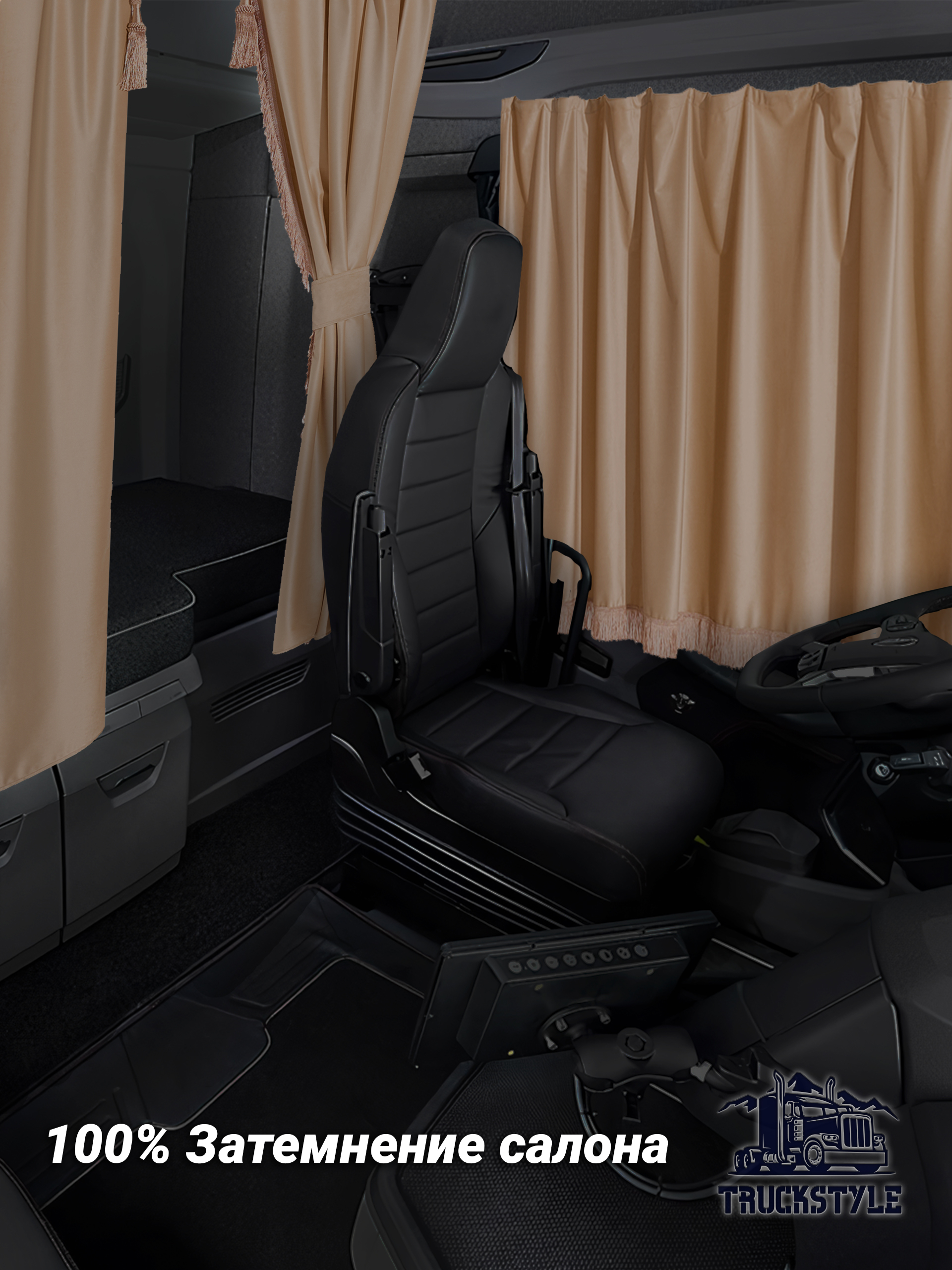 Шторы на лобовое (высота 0,75м, ширина одной стороны - 2,30м) и спальное место (высота 1,45м, ширина одной стороны - 1,15м) с бахромой и кистями в кабину грузовика. Полный комплект. Блэкаут, велюр. Бежевый цвет с прихватами