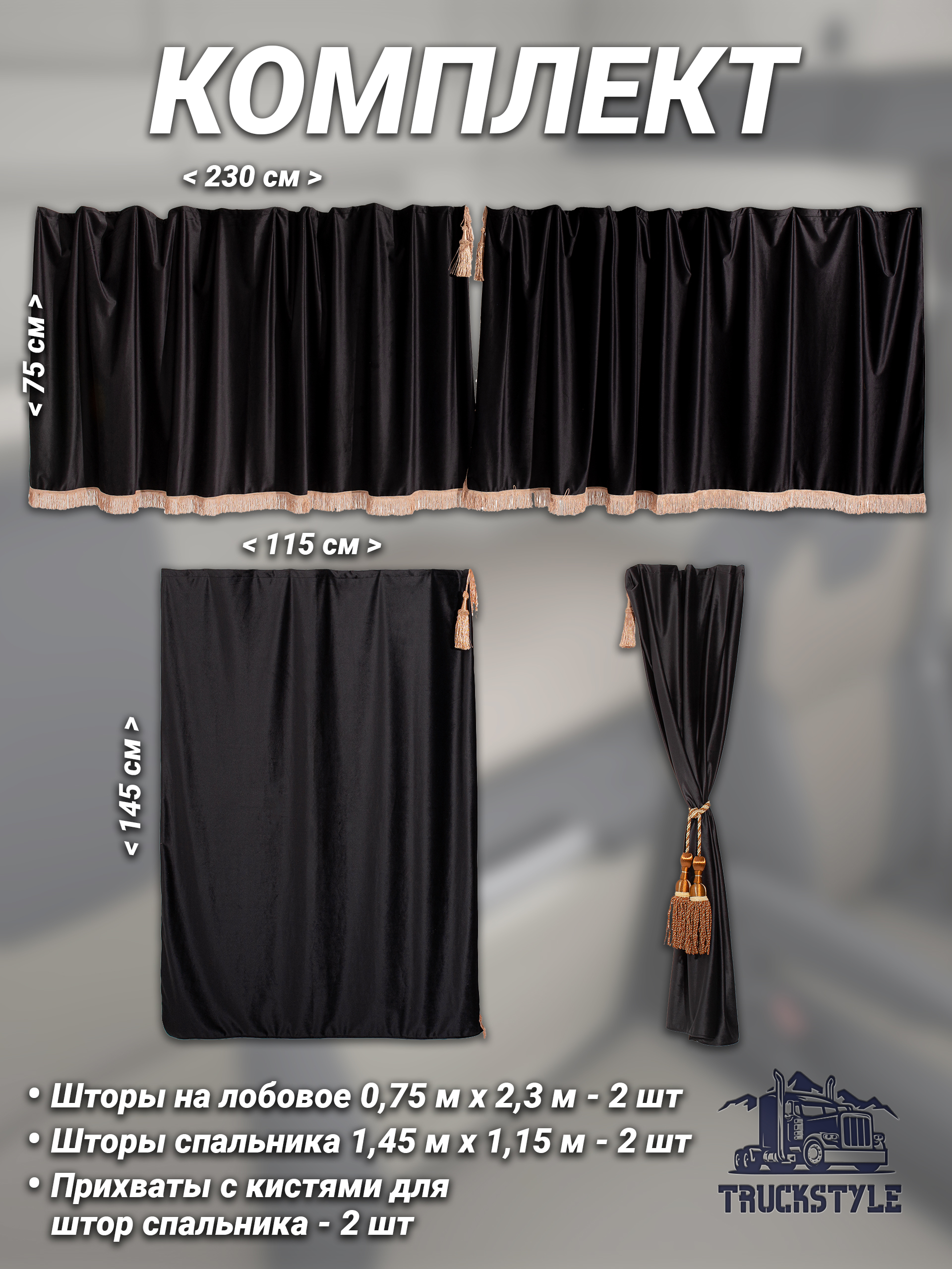 Шторы на лобовое (высота 0,75м, ширина одной стороны - 2,30м) и спальное место (высота 1,45м, ширина одной стороны - 1,15м) с бахромой и кистями в кабину грузовика. Полный комплект. Блэкаут, велюр. Черный цвет с коричневыми кистями-прихватами