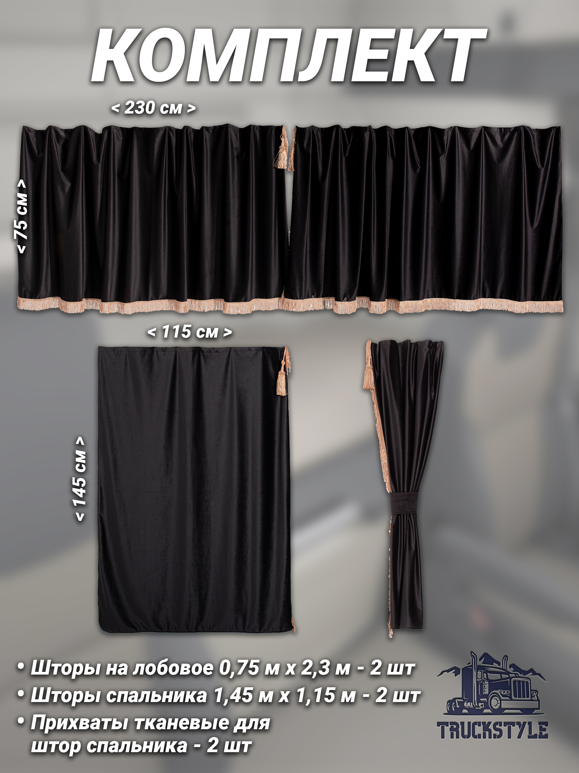 Представляем шторы в салон грузового авто с бахромой и кистями, специально разработанные для автокабин Volvo, Scania, MAN, DAF, Merc, Камаз, Sitrak, Shacman и Foton. Эти автоаксессуары прекрасно подойдут для создания уюта и комфортной атмосферы в вашем грузовом автомобиле. Высота одной стороны лобовых штор составляет 0,75 метра, а ширина одной стороны – 2,30 метра, высота одной стороны спальных штор составляет 1,45 метра, а ширина одной стороны 1,15 метра, что позволяет идеально адаптироваться к интерьеру вашей кабины.