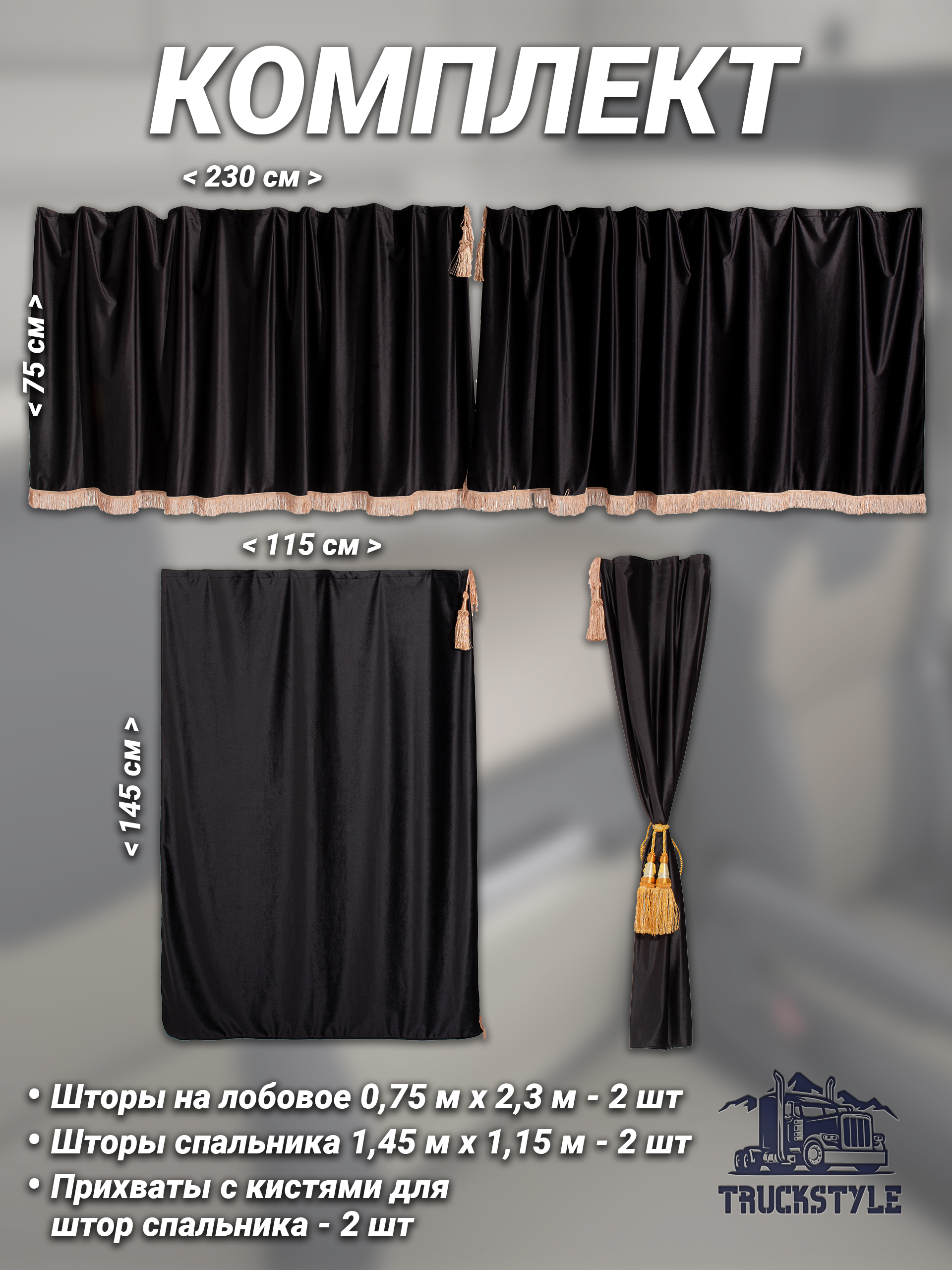 Шторы на лобовое (высота 0,75м, ширина одной стороны - 2,30м) и спальное место (высота 1,45м, ширина одной стороны - 1,15м) с бахромой и кистями в кабину грузовика. Полный комплект. Блэкаут, велюр. Черный цвет с золотыми кистями-прихватами