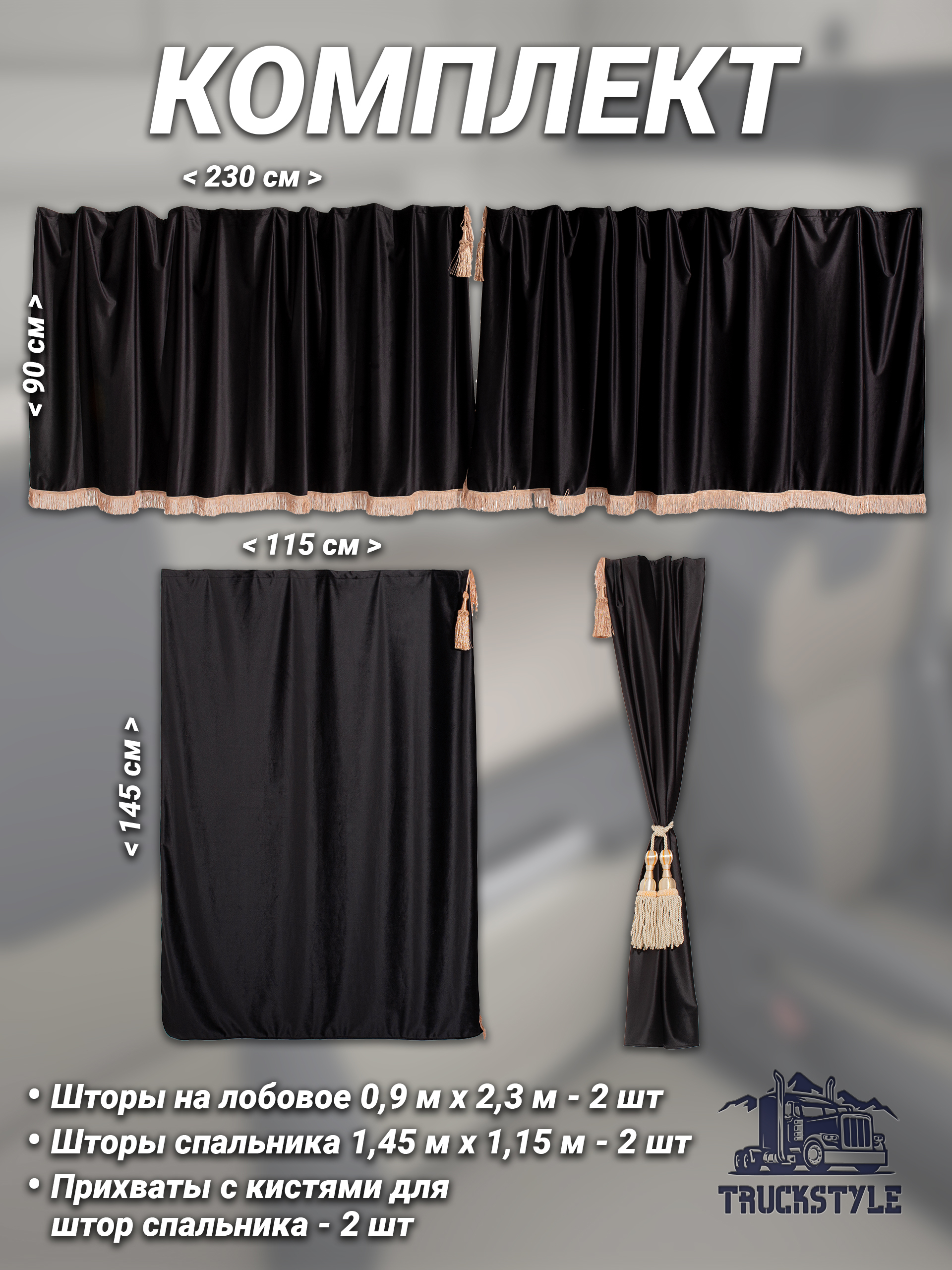 Шторы на лобовое (высота 0,90м, ширина одной стороны - 2,30м) и спальное место (высота 1,45м, ширина одной стороны - 1,15м) с бахромой и кистями в кабину грузовика. Полный комплект. Блэкаут, велюр. Черный цвет с бежевыми кистями-прихватами