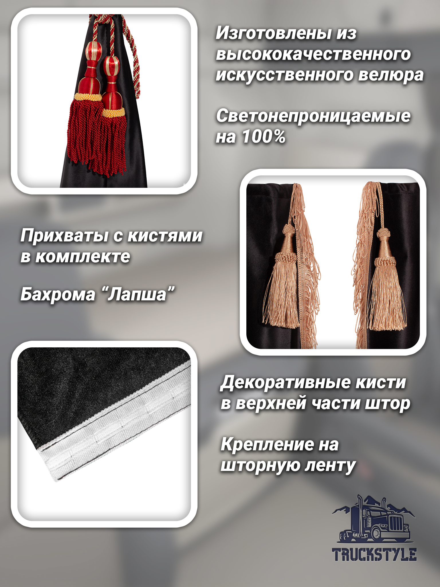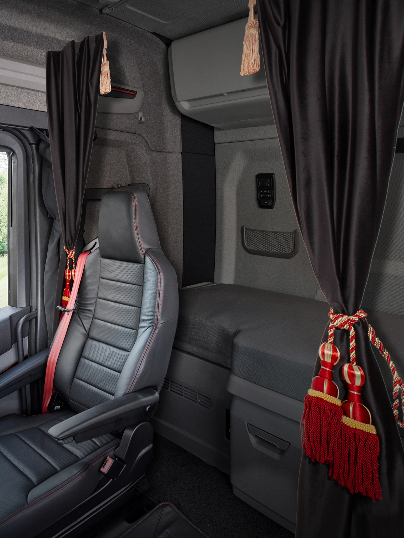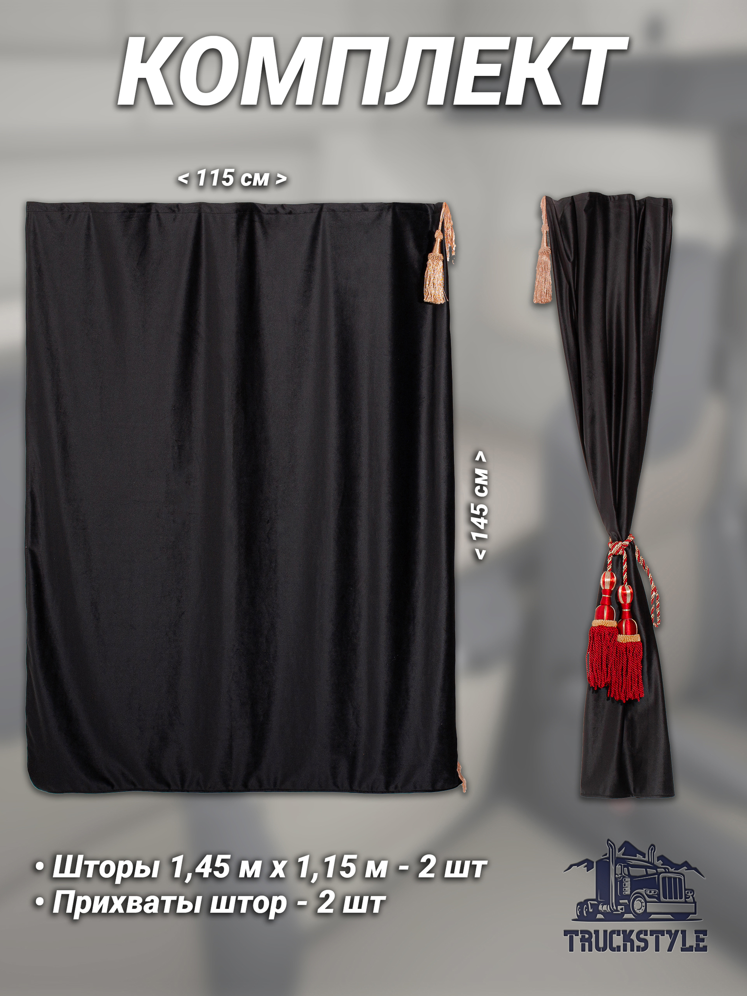Шторы спального места с бахромой и кистями, с прихватами "Кисти" красные в кабину Volvo, Scania, MAN, DAF, Merc, Камаз, Sitrak, Shacman, Foton, FAW. Высота 1,45м, ширина одной стороны - 1,15м. Блэкаут, велюр. Черный цвет с красными кистями-прихватами