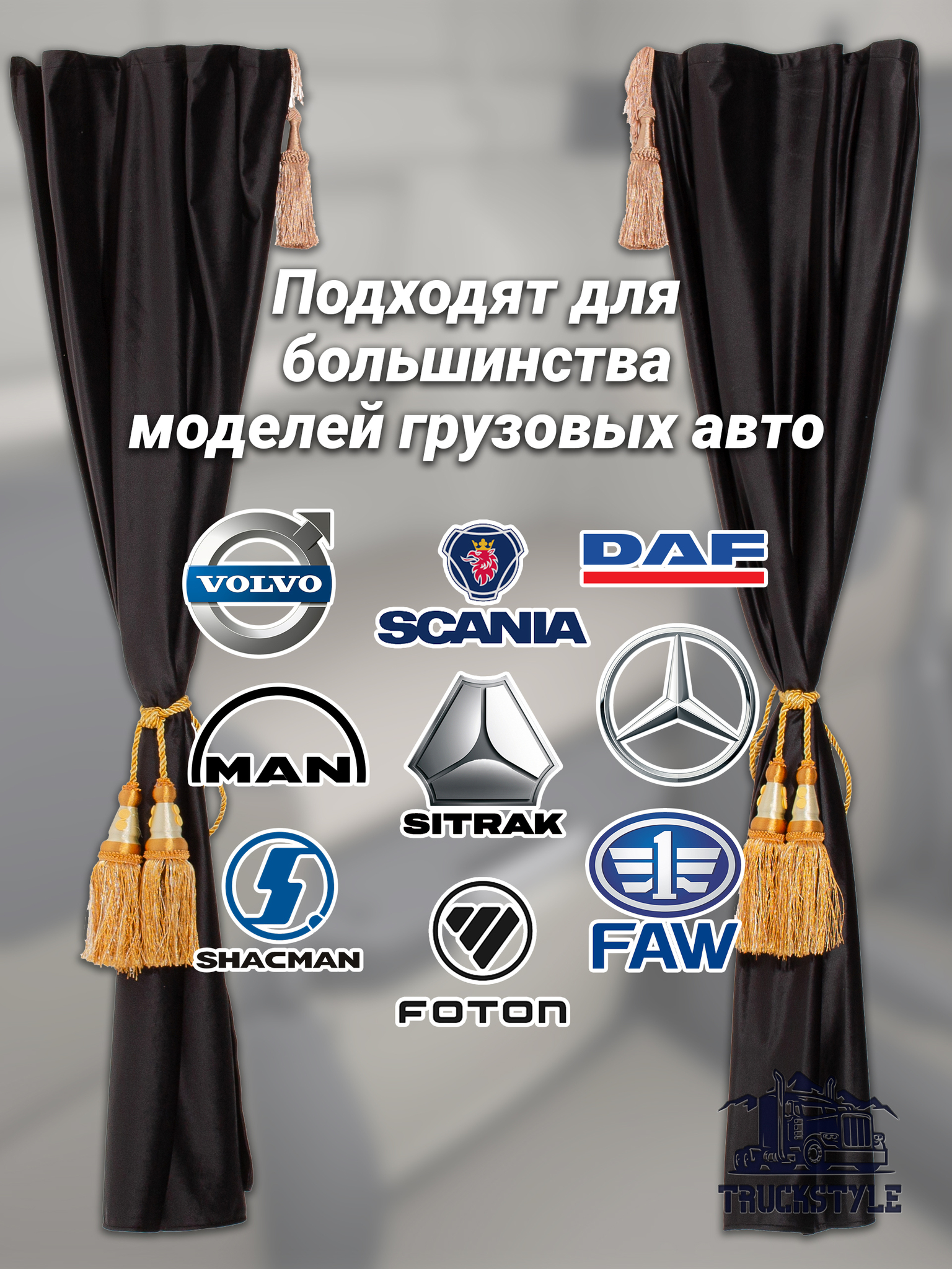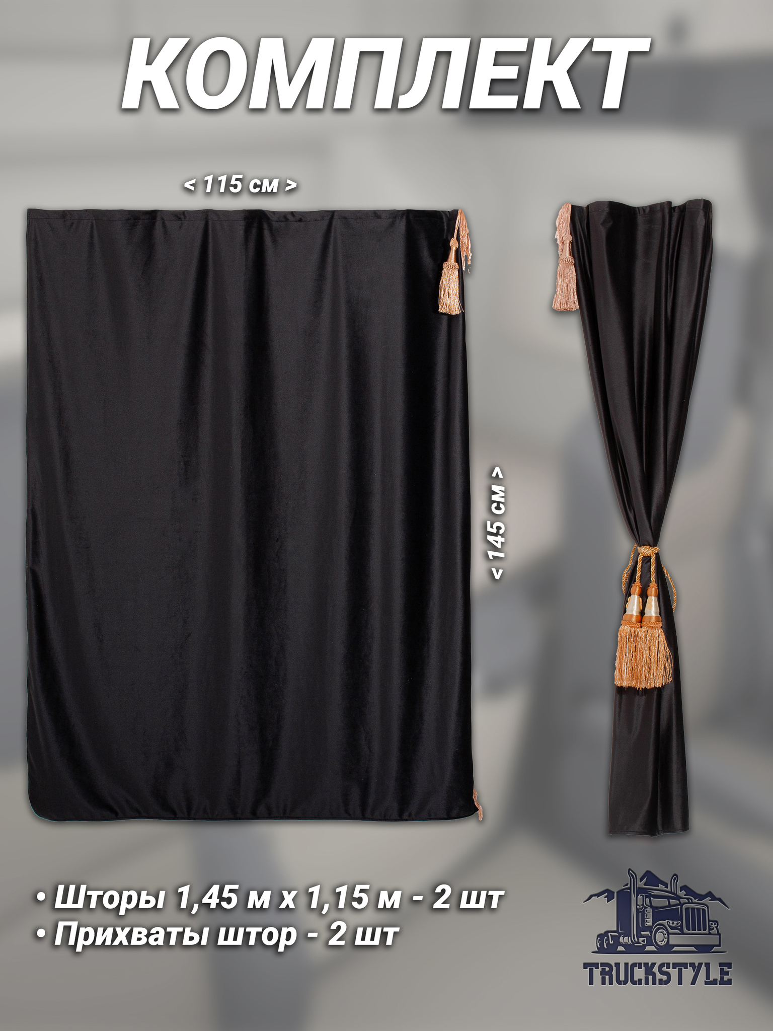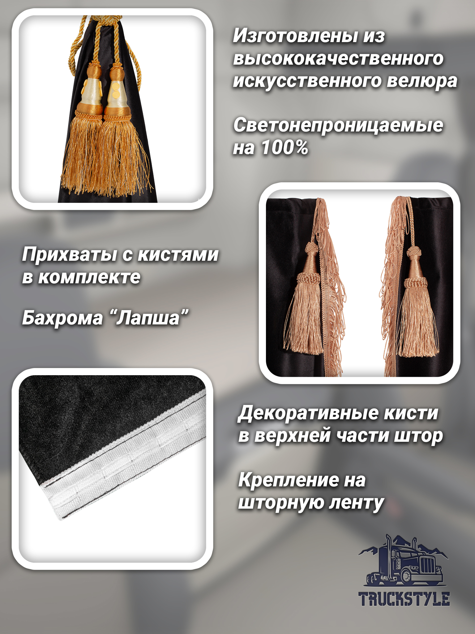 Шторы спального места с бахромой и кистями, с прихватами "Кисти" золотые в кабину Volvo, Scania, MAN, DAF, Merc, Камаз, Sitrak, Shacman, Foton, FAW. Высота 1,45м, ширина одной стороны - 1,15м. Блэкаут, велюр. Черный цвет с золотыми кистями-прихватами