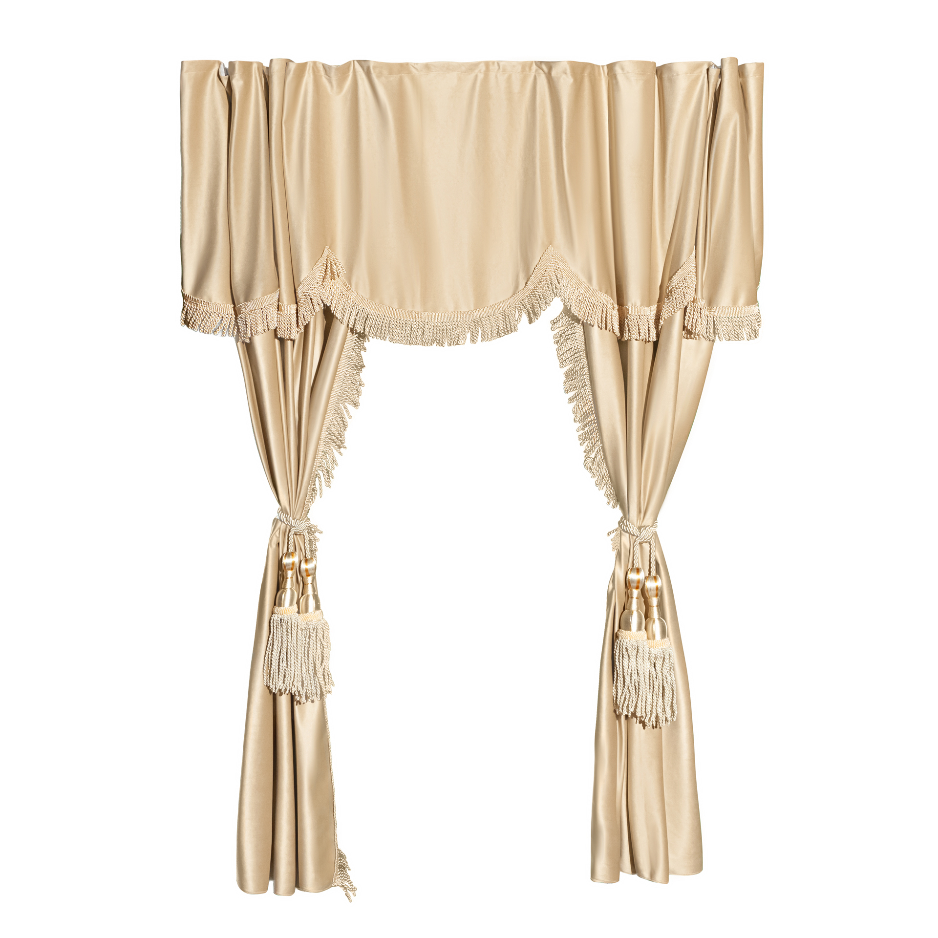 Шторы спального места с ламбрекеном и прихватами "Кисти" в кабину Volvo, Scania, MAN, DAF, Merc, Камаз, Sitrak, Shacman, Foton, FAW. Высота 1,5м, ширина одной стороны - 1,15м. Блэкаут, велюр. Бежевый цвет с бежевой бахромой и бежевыми кистями
