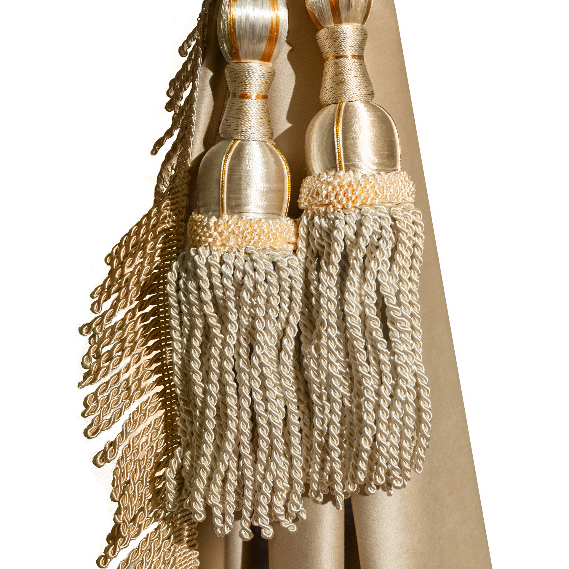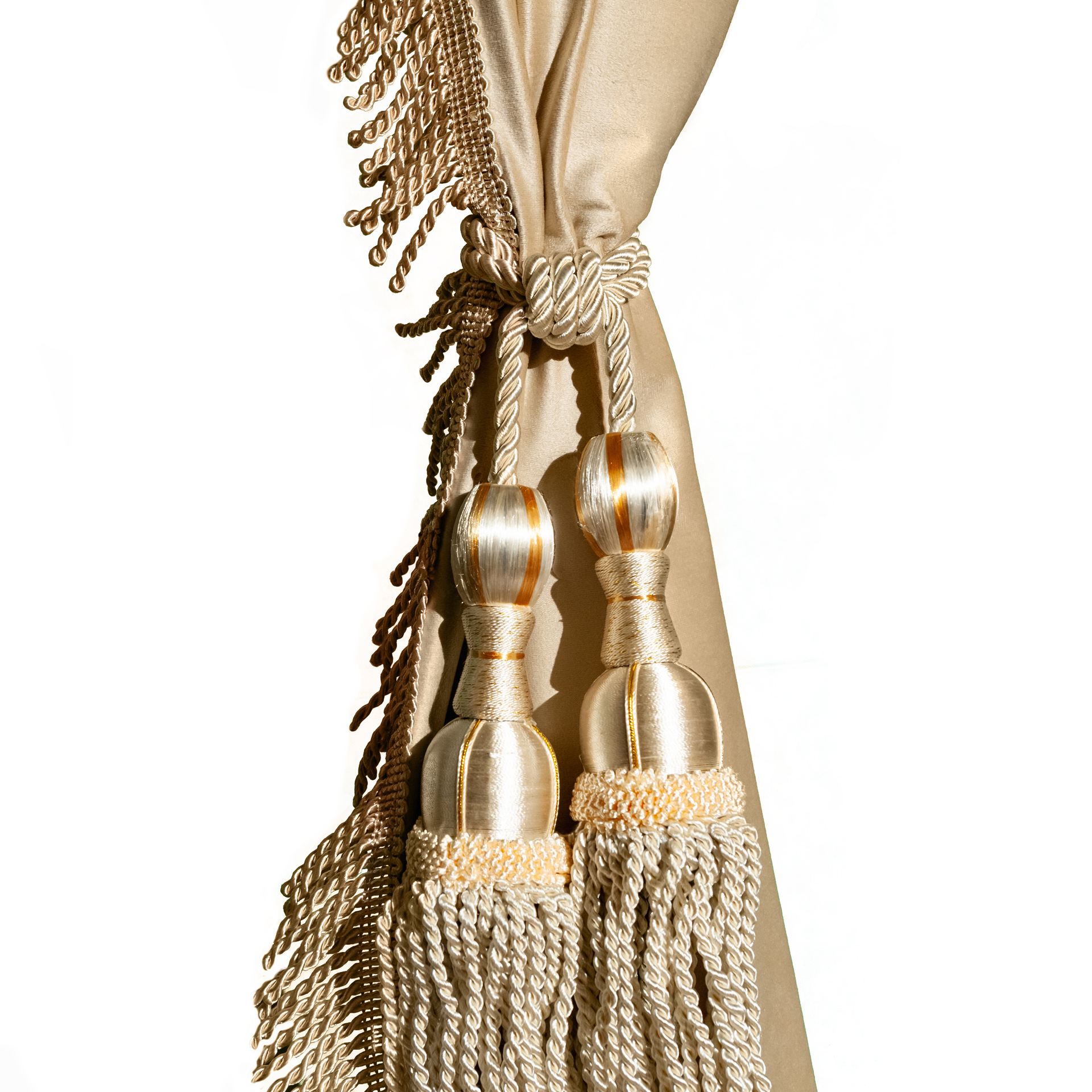 Изготовлены из качественного двойного велюра, шторы обладают свойствами блэкаут, что обеспечивает надежную защиту от солнечных лучей и лишних взглядов. Бежевый цвет с роскошной золотой бахромой придаёт вашим шторкам стильный и элегантный вид, отлично сочетаясь с любым интерьером.