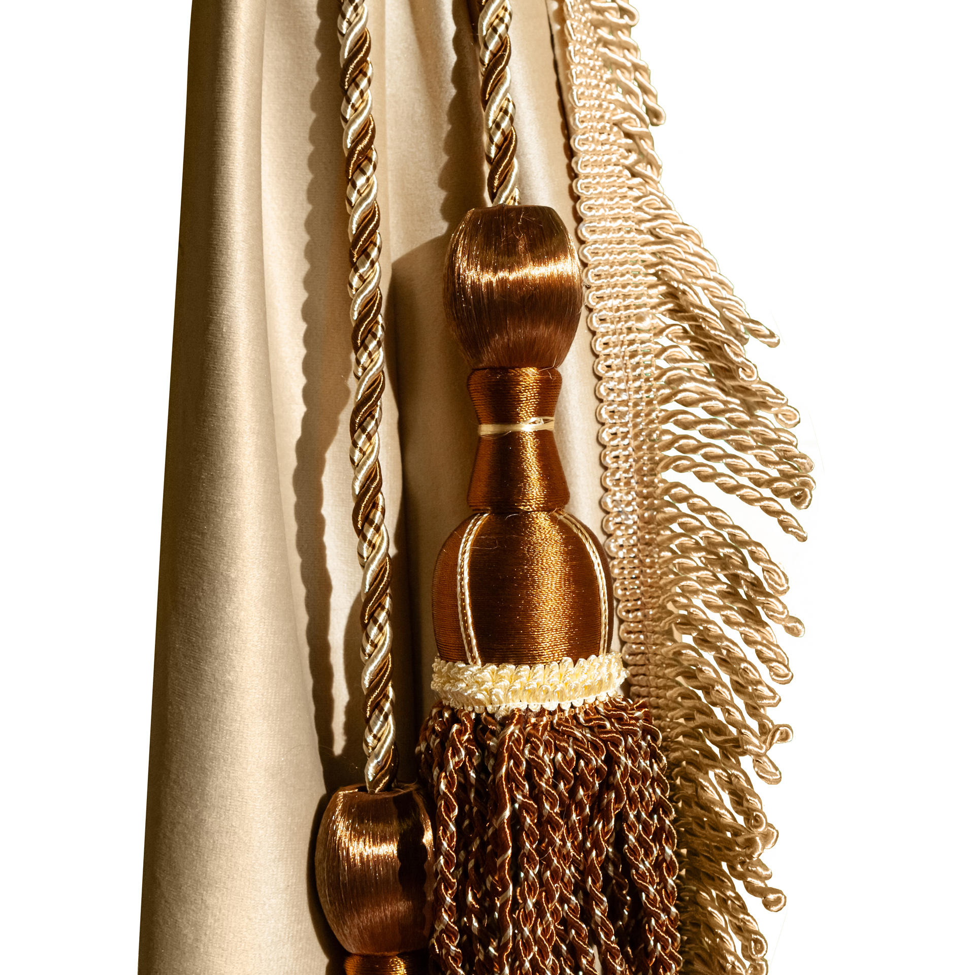Изготовлены из качественного двойного велюра, шторы обладают свойствами блэкаут, что обеспечивает надежную защиту от солнечных лучей и лишних взглядов. Бежевый цвет с роскошной золотой бахромой придаёт вашим шторкам стильный и элегантный вид, отлично сочетаясь с любым интерьером.