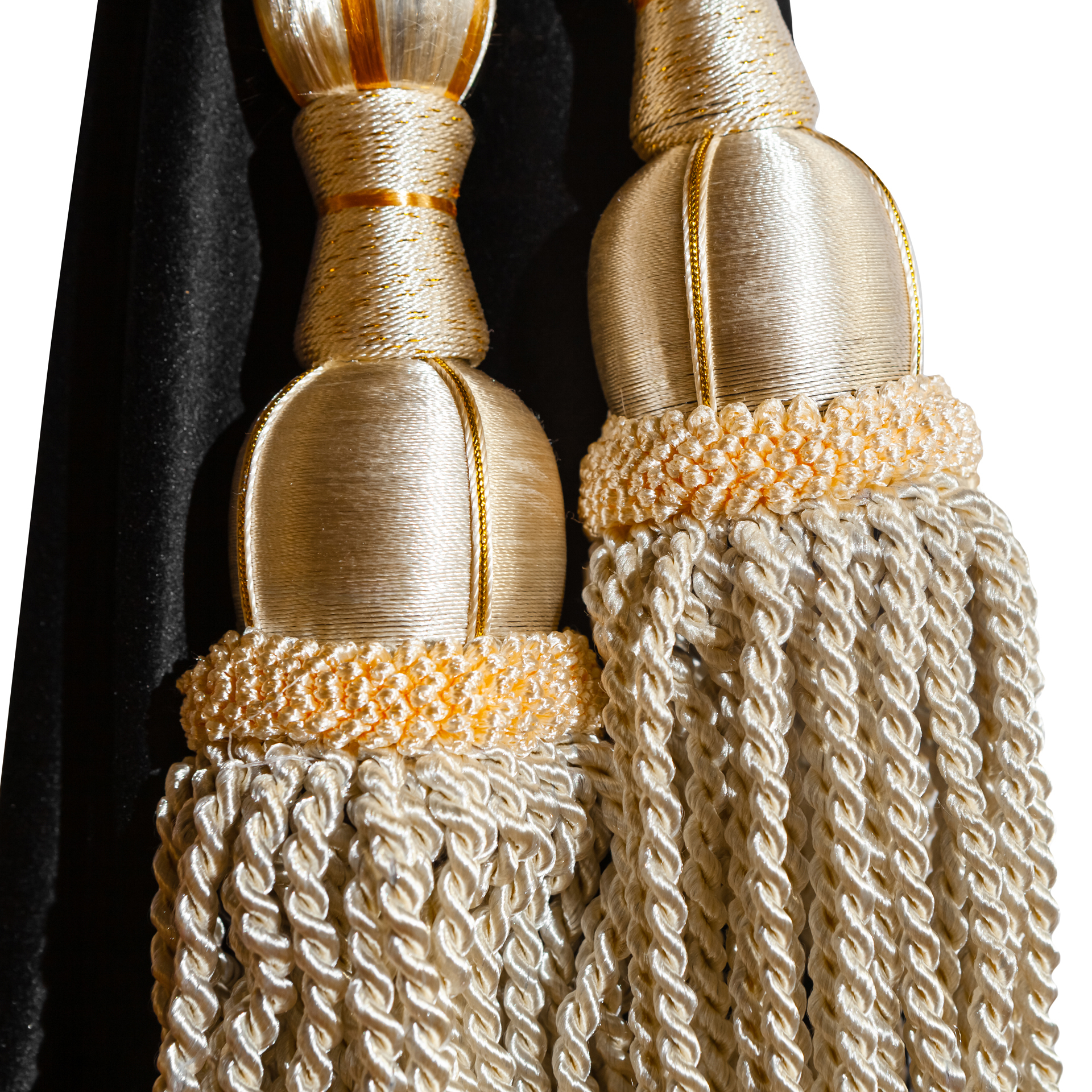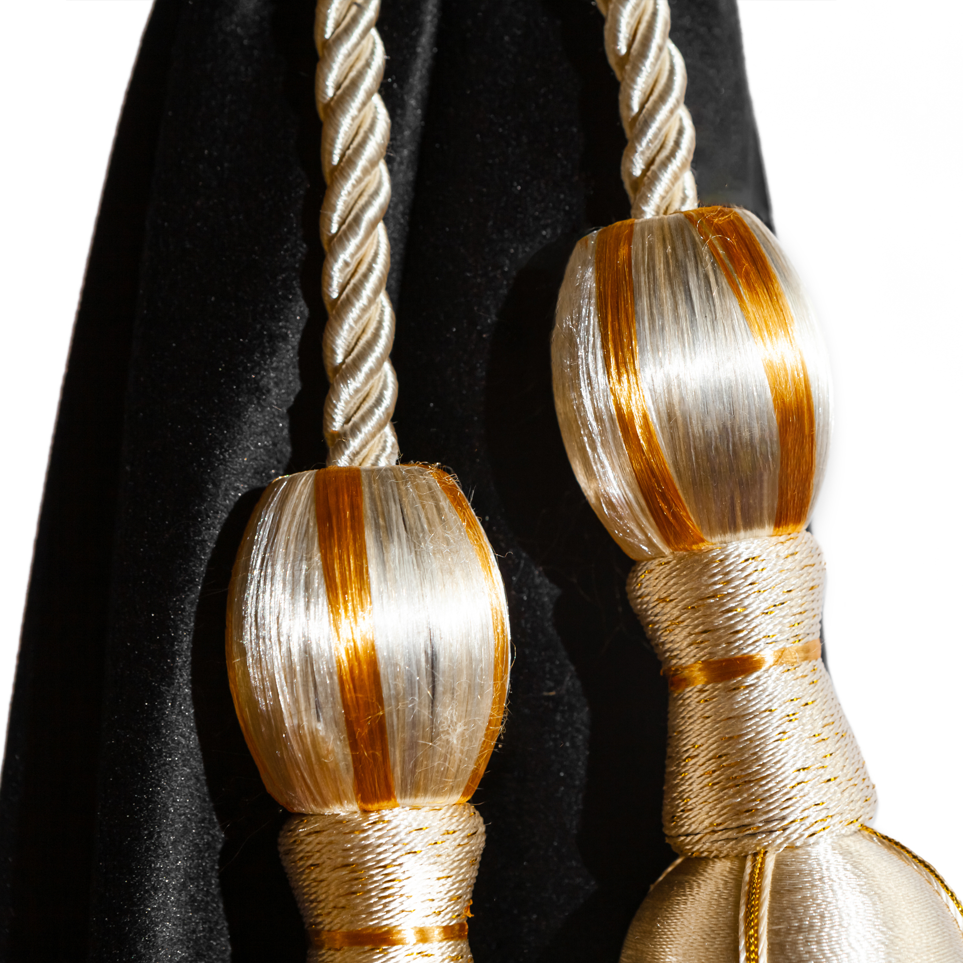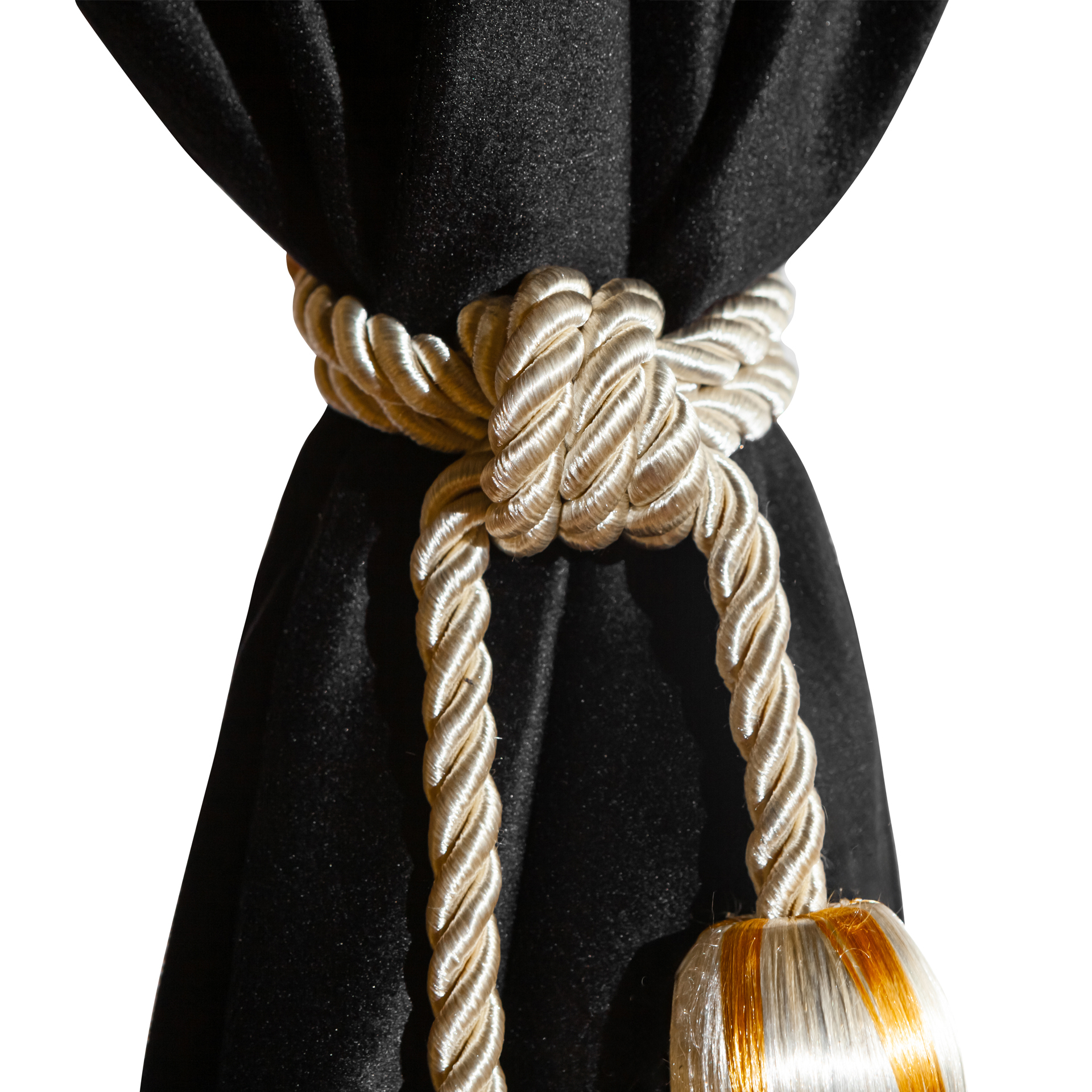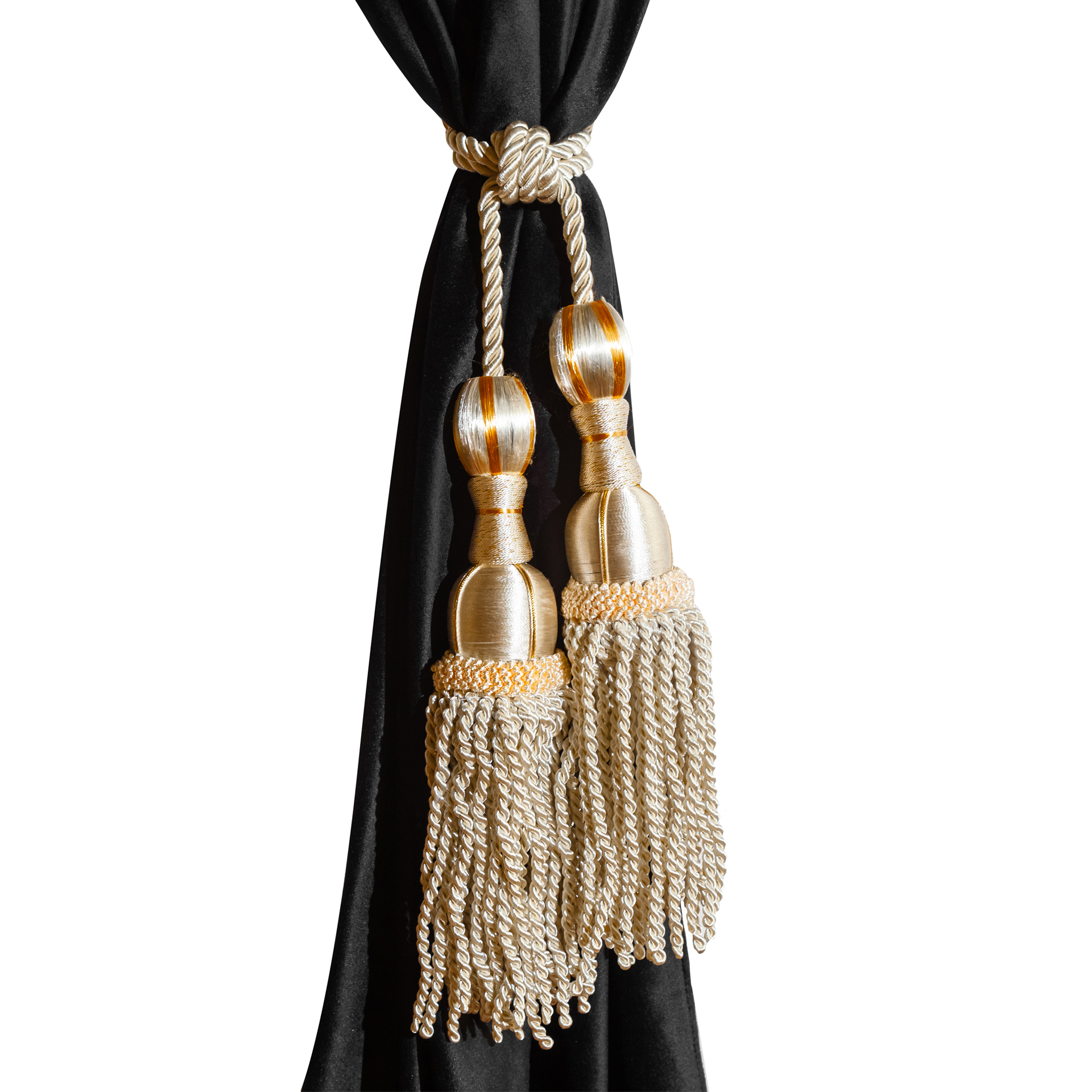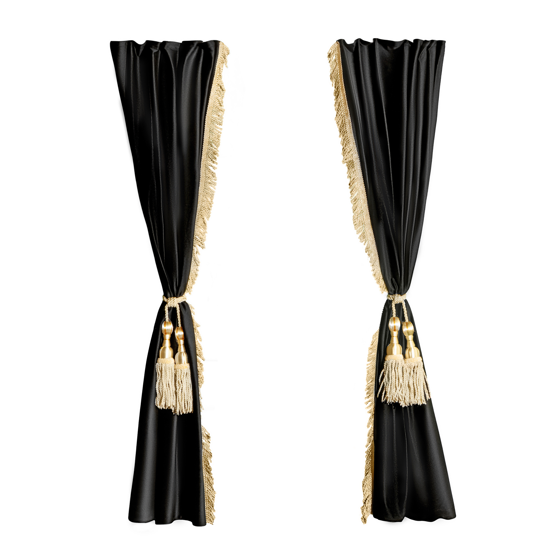 Изготовлены из качественного двойного велюра, шторы обладают свойствами блэкаут, что обеспечивает надежную защиту от солнечных лучей и лишних взглядов. Черный цвет с роскошной золотой бахромой придаёт вашим шторкам стильный и элегантный вид, отлично сочетаясь с любым интерьером.