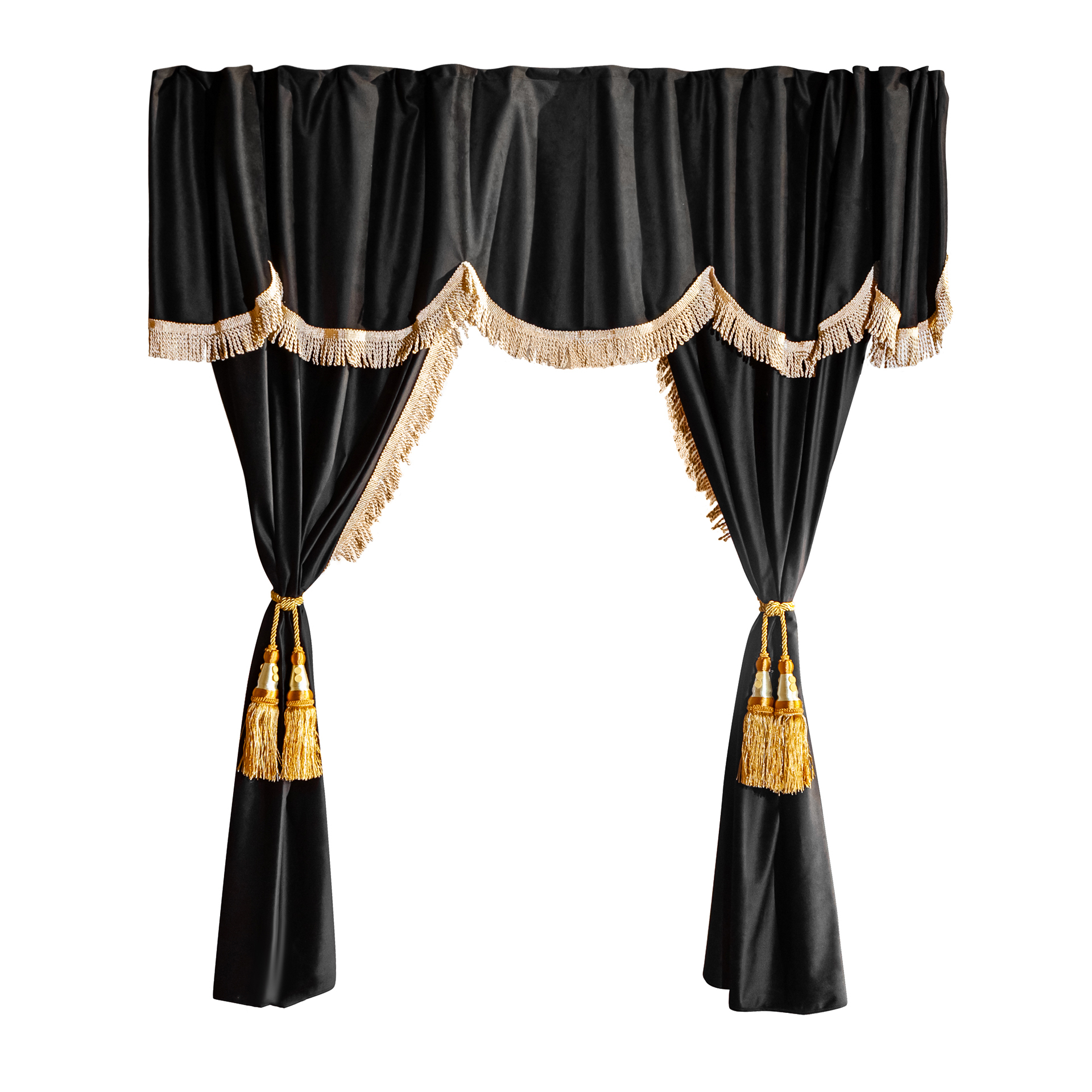 Шторы спального места с ламбрекеном и прихватами "Кисти" в кабину Volvo, Scania, MAN, DAF, Merc, Камаз, Sitrak, Shacman, Foton, FAW. Высота 1,5м, ширина одной стороны - 1,15м. Блэкаут, велюр. Черный цвет с бежевой бахромой и золотыми кистями
