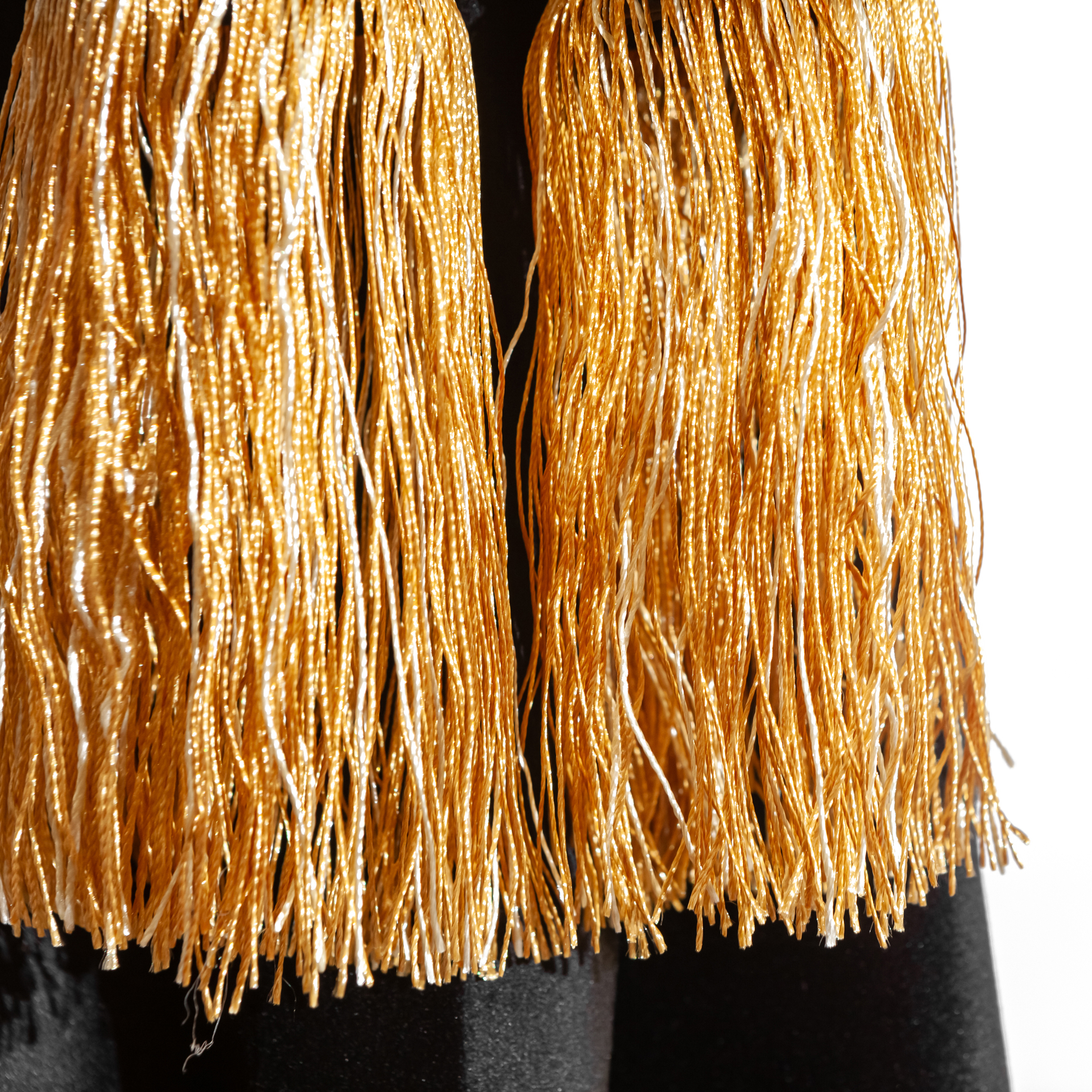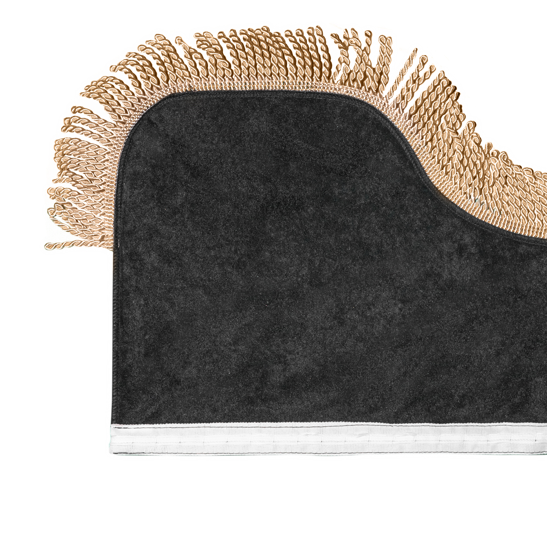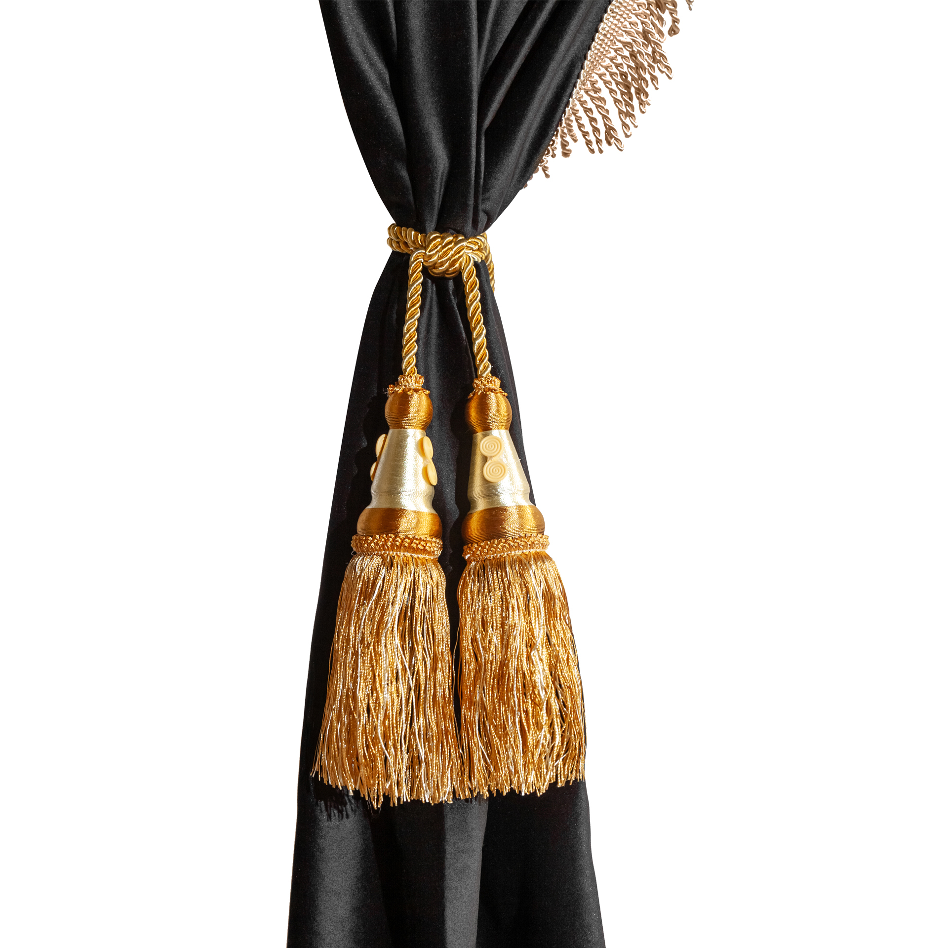 Изготовлены из качественного двойного велюра, шторы обладают свойствами блэкаут, что обеспечивает надежную защиту от солнечных лучей и лишних взглядов. Черный цвет с роскошной золотой бахромой придаёт вашим шторкам стильный и элегантный вид, отлично сочетаясь с любым интерьером.