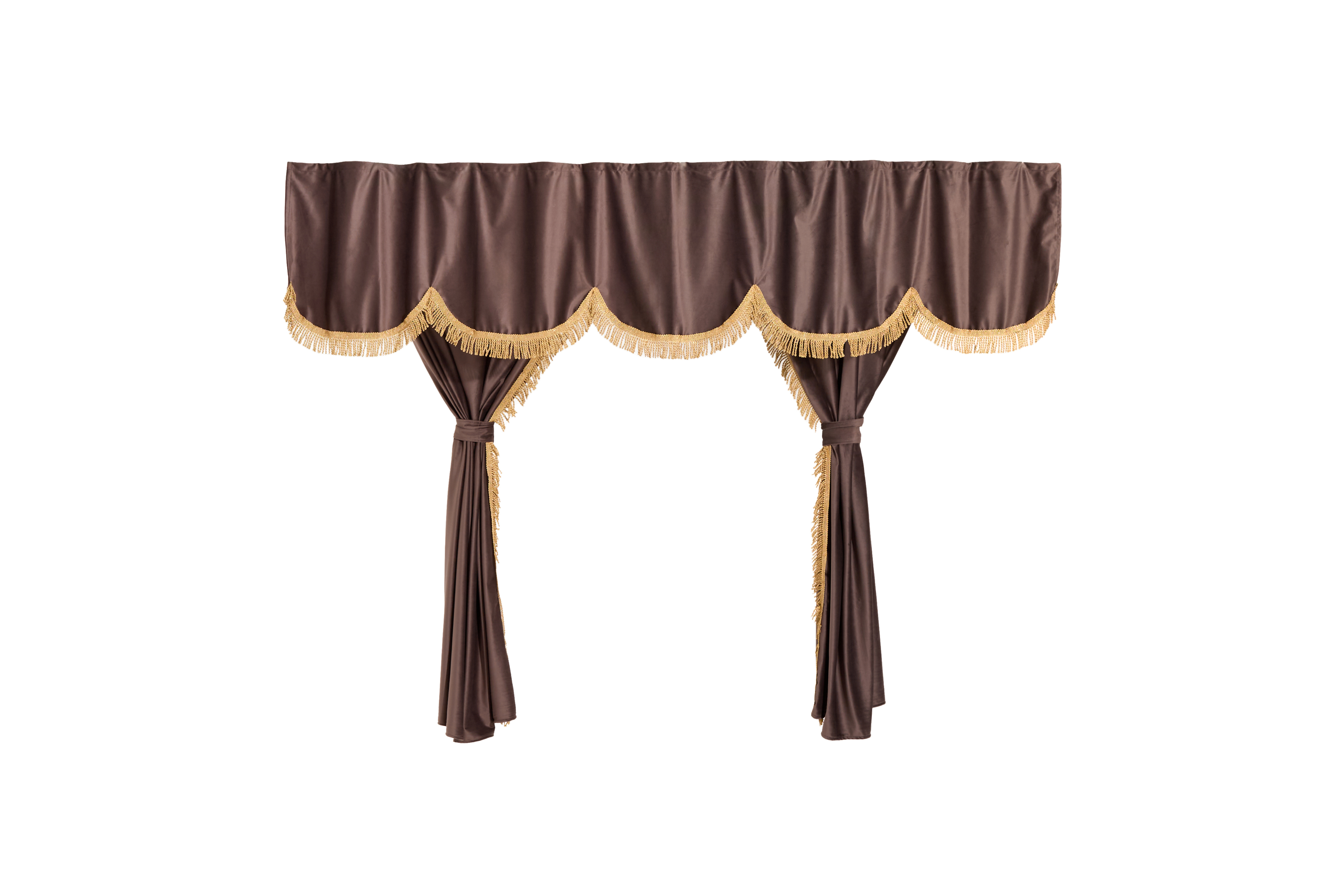 Шторы спального места с ламбрекеном и прихватами в кабину Volvo, Scania, MAN, DAF, Merc, Камаз, Sitrak, Shacman, Foton, FAW. Высота 1,5м, ширина одной стороны - 1,15м. Блэкаут, велюр. Кофейный цвет с бежевой бахромой
