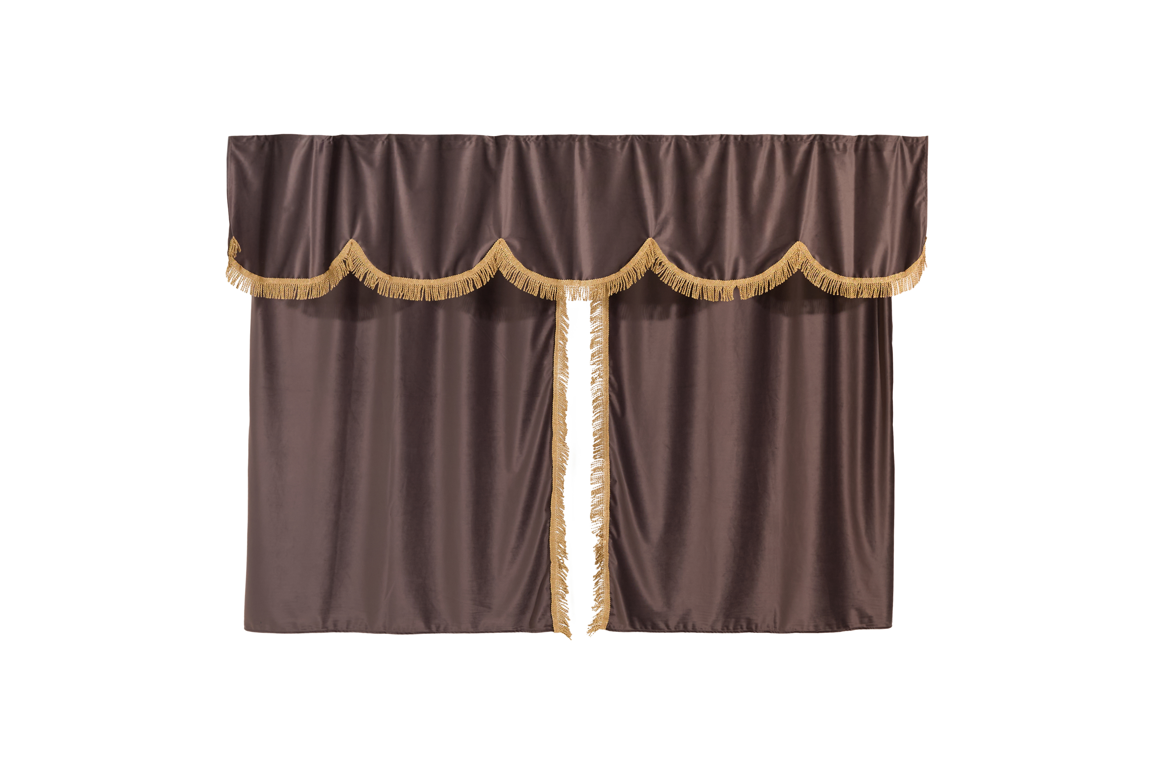 Шторы спального места с ламбрекеном в кабину Volvo, Scania, MAN, DAF, Merc, Камаз, Sitrak, Shacman, Foton, FAW. Высота 1,5м, ширина одной стороны - 1,15м. Блэкаут, велюр. Кофейный цвет с бежевой бахромой