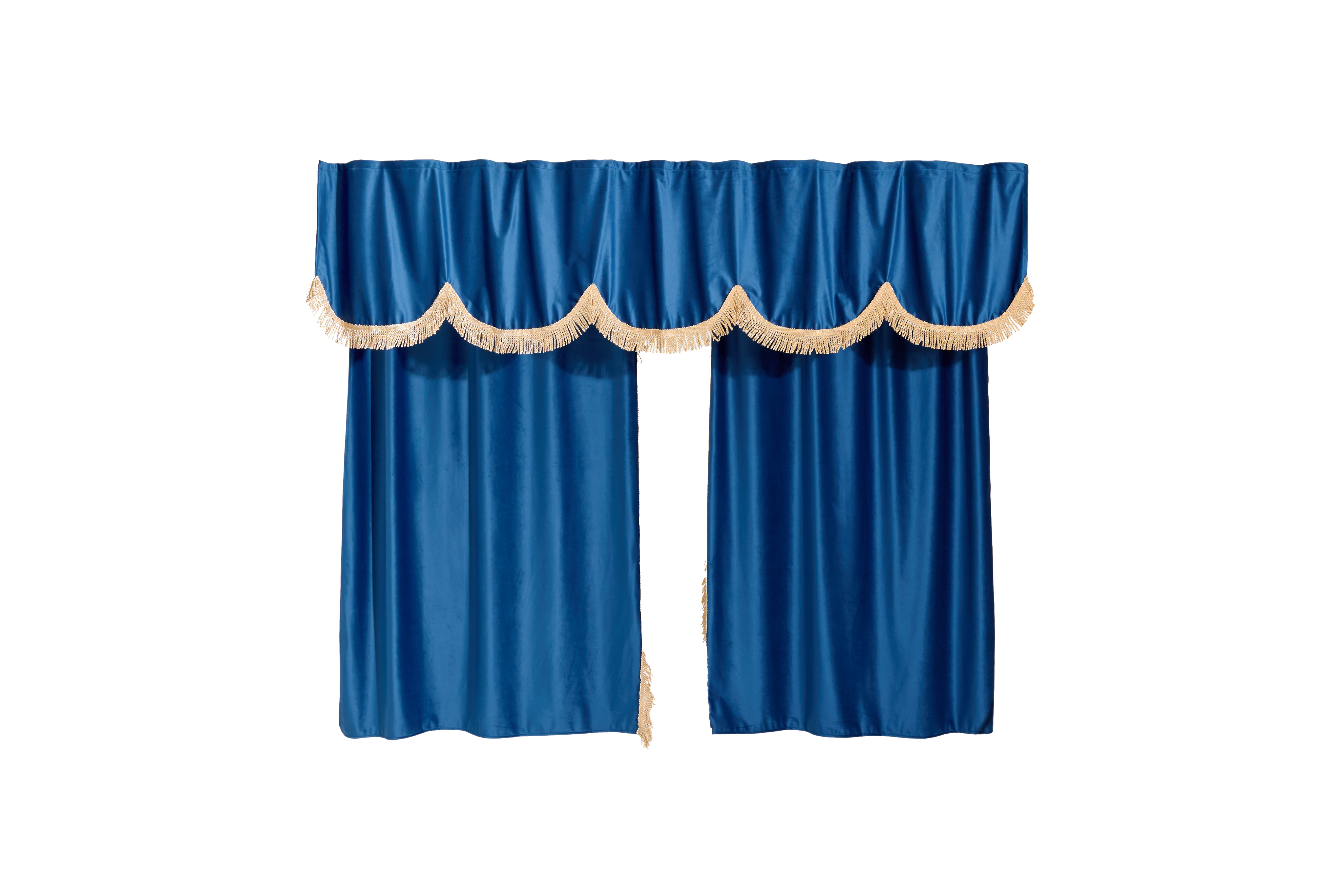 Шторы спального места с ламбрекеном в кабину Volvo, Scania, MAN, DAF, Merc, Камаз, Sitrak, Shacman, Foton, FAW. Высота 1,5м, ширина одной стороны - 1,15м. Блэкаут, велюр. Синий цвет с бежевой бахромой