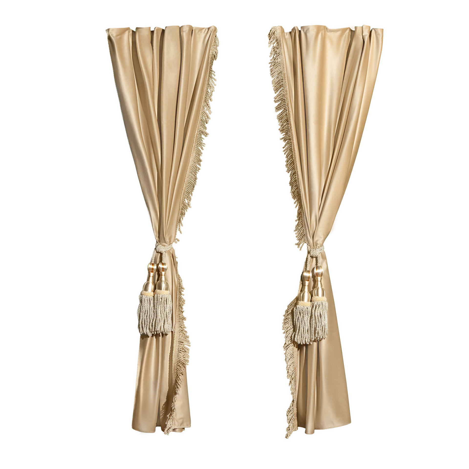 Изготовлены из качественного двойного велюра, шторы обладают свойствами блэкаут, что обеспечивает надежную защиту от солнечных лучей и лишних взглядов. Черный цвет с роскошной золотой бахромой придаёт вашим шторкам стильный и элегантный вид, отлично сочетаясь с любым интерьером.