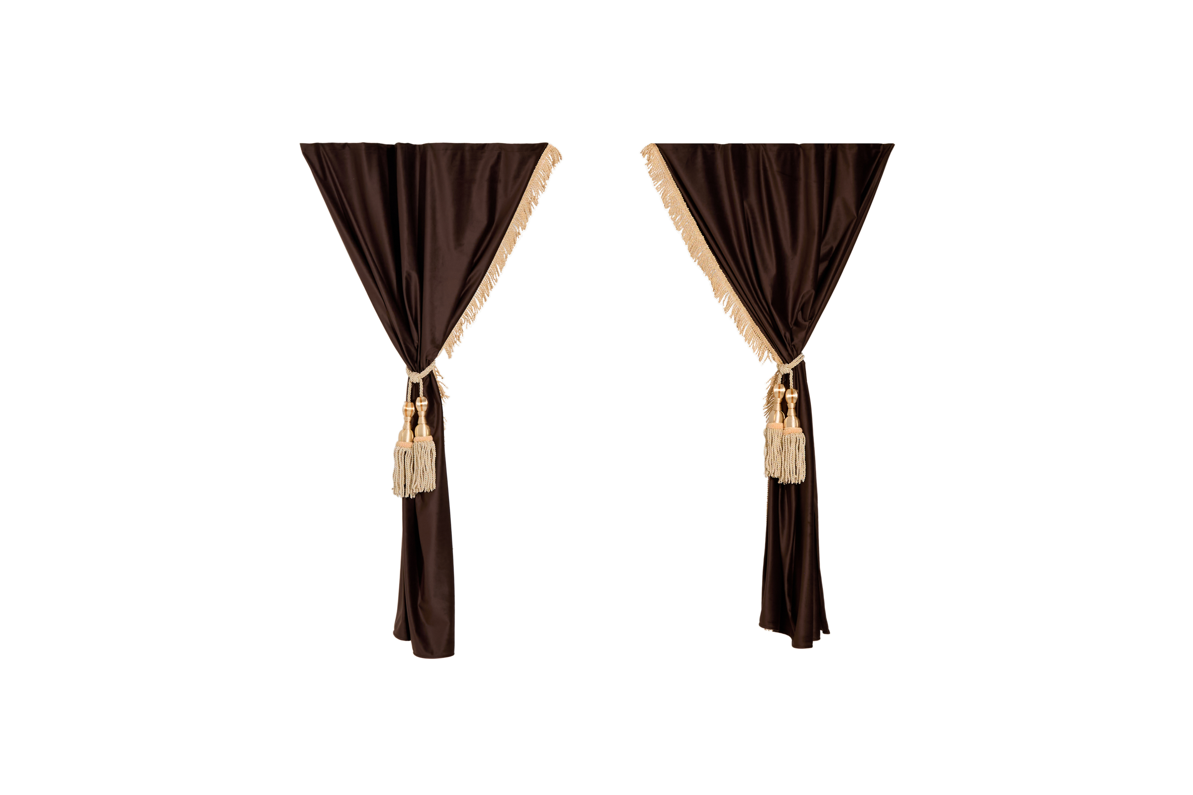 Шторы спального места с прихватами "Кисти" бежевые в кабину Volvo, Scania, MAN, DAF, Merc, Камаз, Sitrak, Shacman, Foton, FAW. Высота 1,5м, ширина одной стороны - 1,15м. Блэкаут, велюр. Коричневый цвет с бежевой бахромой и бежевыми кистями